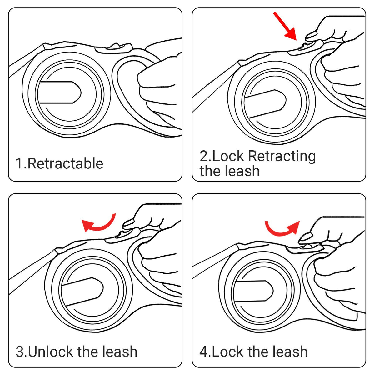 Cautions: Consider in advance how your dog might react in unpredictable situations. For safety reasons, keeps your dog at your side before any possible dangerous situation emerges. The retractable dog leash should not be used by children. Do not try to open the plastic casing or disassemble any other parts, the spring inside may cause unexpected injuries. Do not hold or grab the tape and do not allow the tape to become wrapped around parts of the body, you may get hurt. The dog may bite the belt when the first time you use the product, which is normal. So please pay attention to it and avoid the damage caused by dog biting or sharp items.