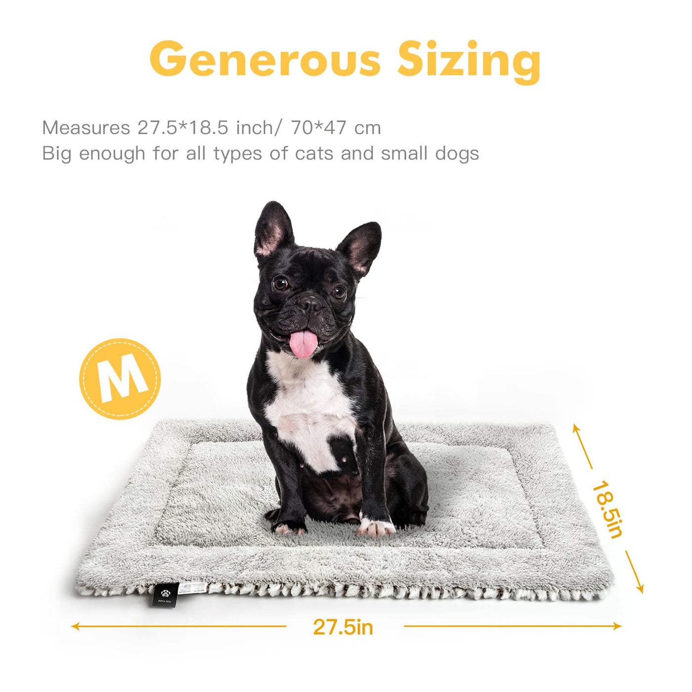 Q: What size pets can use the thermal cat mat?A: The large size of 27.5" x 18.5" makes this thermal cat mat suitable for most cats, large kittens, and small dogs, providing ample space for them to relax comfortably.