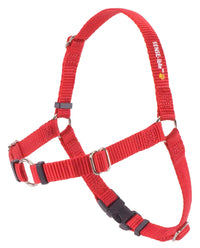 The SENSE-ible Harness Gently Stops Dogs From Pulling. The SENSE-ible Harness is a front-leash attachment harness - very different from the 'sled dog' style of most harnesses on the market. The leash attaches to a ring on the chest, so you can provide more accurate cues to your dog as to the direction that you want to go. It reduces pulling and often enables a smoother, more enjoyable walk for both dog and human. Quality hardware and construction. Nylon curved side-release buckle and belt loops. Nickel-plated metal slide adjusters and welded o-rings. For best results, please measure your dog to ensure a proper fit. The Softouch Training method applies horse training concepts to teach dogs not to jump, lunge, forge or pull. It also assists with teaching commands such as: sit, down, wait, come, stand and heel. Dogs learn quickly with their SENSE of touch and natural instincts without stress or injuries. Available in black or red. Measure your dog's girth using a tape measure. Measure around the body (the rib cage) behind the front legs. 17 - 21' Girth = X-Small (12 - 20 lbs), 21.5 - 24' Girth = Small (21 - 33 lbs), 24.5 - 28 ' Girth = Medium (34 - 60 lbs), 27 - 33' Girth = Medium/Large in 3/4' Narrow or 1' Wide (40 - 75 lbs), 32.5 - 40' Girth = Large (70 - 130 lbs), 39 - 50' Girth = X-Large (131 - 200 lbs).