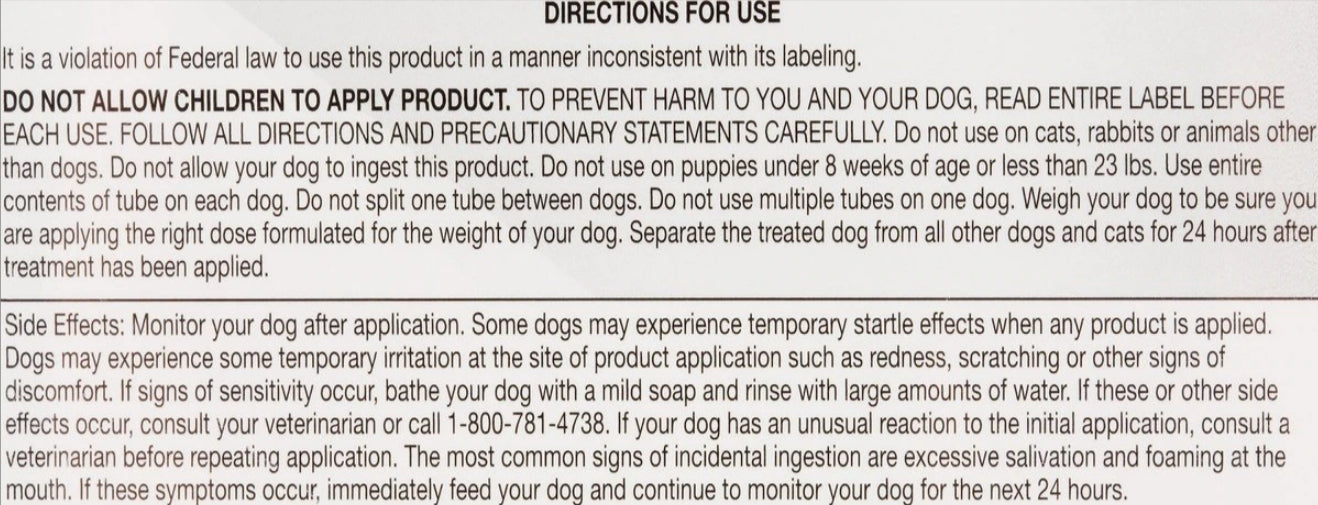 FiproGuard for Dogs is a Topical Flea and Tick Treatment is the first retail generic equivalent to FRONTLINE Top Spot for dogs. FiproGuard contains Fipronil - the active ingredient used in FRONTLINE Top Spot for dogs.FiproGuard contains Fipronil - the active ingredient in Frontline Top SpotKills fleas, ticks, and chewing liceWaterproof - remains effective even after bathingMedium dogs up to 23-44 lbs (over 8 weeks)FiproGuard kills deer ticks that transmit Lyme disease as well as brown dog ticks, American dog ticks and lone star ticks. It also controls mites that may cause sarcoptic mange. FIPROGUARD is waterproof and remains effective, even after bathing, water immersion, or exposure to sunlight. Sentry FiproGuard is safe for use on puppies over 8 weeks of age and can be used on breeding, pregnant and lactating dogs. Fast-acting and long-lasting, sustained-release formula protects dogs for up to 30 days.DIRECTIONS FOR USE: It is a violation of Federal law to use this product in a manner inconsistent with its labeling. DO NOT ALLOW CHILDREN TO APPLY PRODUCT. TO PREVENT HARM TO YOU AND YOUR DOG READ ENTIRE LABEL BEFORE EACH USE. FOLLOW ALL DIRECTIONS AND PRECAUTIONARY STATEMENTS CAREFULLY. FOR EXTERNAL USE ON DOGS ONLY. DO NOT USE ON RABBITS. DO NOT USE ON OTHER ANIMALS. Do not use on puppies under 8 weeks of age. Do not split one tube between dogs. Do not use multiple tubes on one dog. Weigh your dog to be sure you are applying the right dose formulated for the weight of your dog. Consult a veterinarian before using this product on debilitated, aged, or medicated dogs. Can be used on breeding, pregnant, or lactating dogs. Consult a veterinarian before using on dogs with known organ dysfunction. Dogs may experience some temporary irritation at the site of product application. Certain medications can interact with pesticides. Sensitivities may occur after using ANY pesticide product on dogs. If signs of sensitivity occur bathe your dog with mild soap and rinse with large amounts of water. If signs continue, consult a veterinarian immediately. How to open: Remove product tubes from the package. Separate one tube from the others. Holding the tube with notched end pointing up and away from the face and body, cut off the narrow end at the notches with scissors. How to apply: Invert tube over dog and use open end to part dogs hair. Squeeze tube firmly to apply all of the solutions to the dogs skin, as directed below. Do not apply more often than once every 4 weeks.FREQUENCY OF APPLICATION: Use FIPROGUARD monthly for complete control of flea, tick and chewing lice infestations. Studies show that FIPROGUARD kills adult fleas for up to three months. Apply monthly if your dog is at high risk for flea reinfestation. Apply monthly to control ticks, and chewing lice. FIPROGUARD remains effective, even after bathing, water immersion, or exposure to sunlight. Allow the treated area to dry thoroughly. Do not reapply for 30 days.Apply one tube as a spot on the dogs back between the shoulder blades.