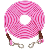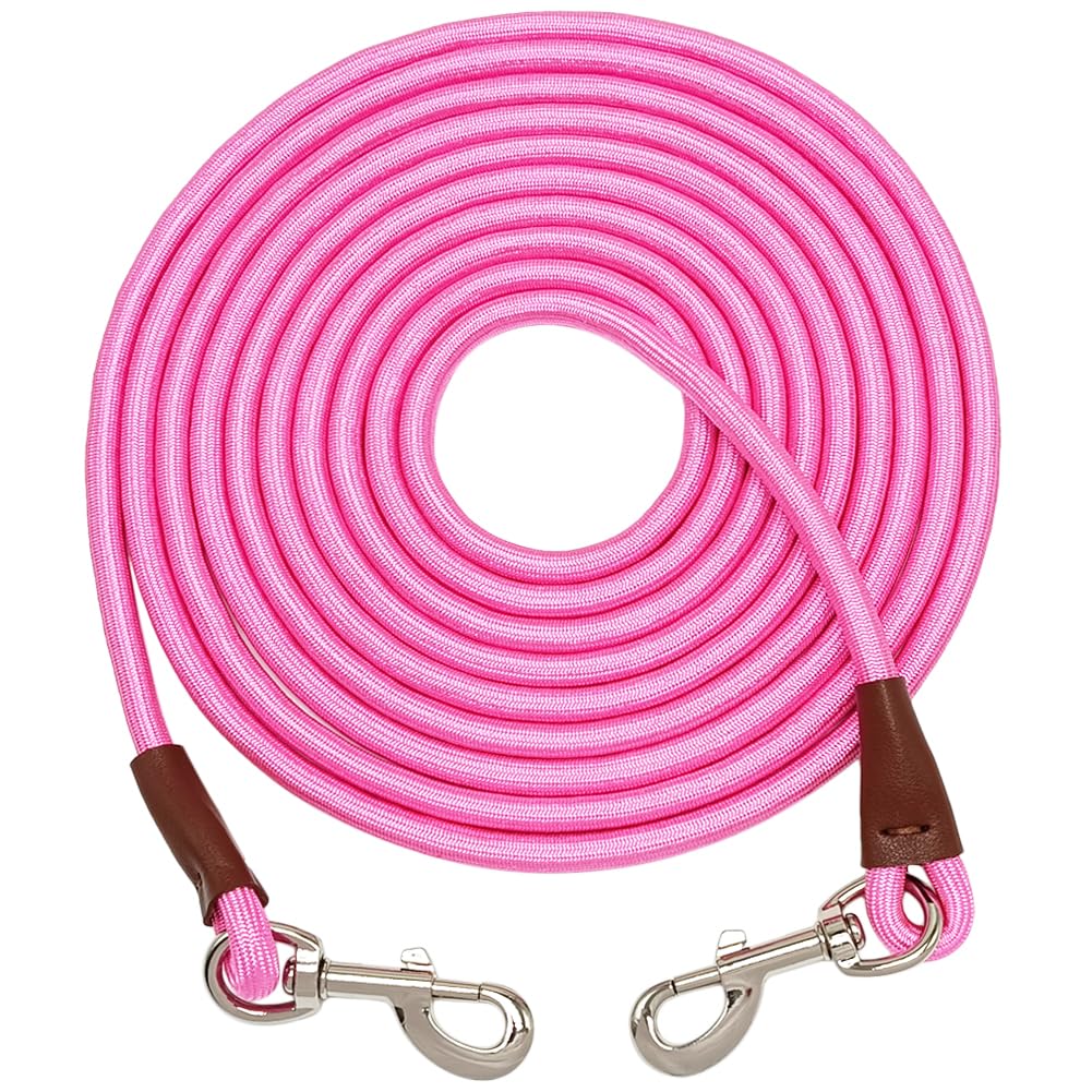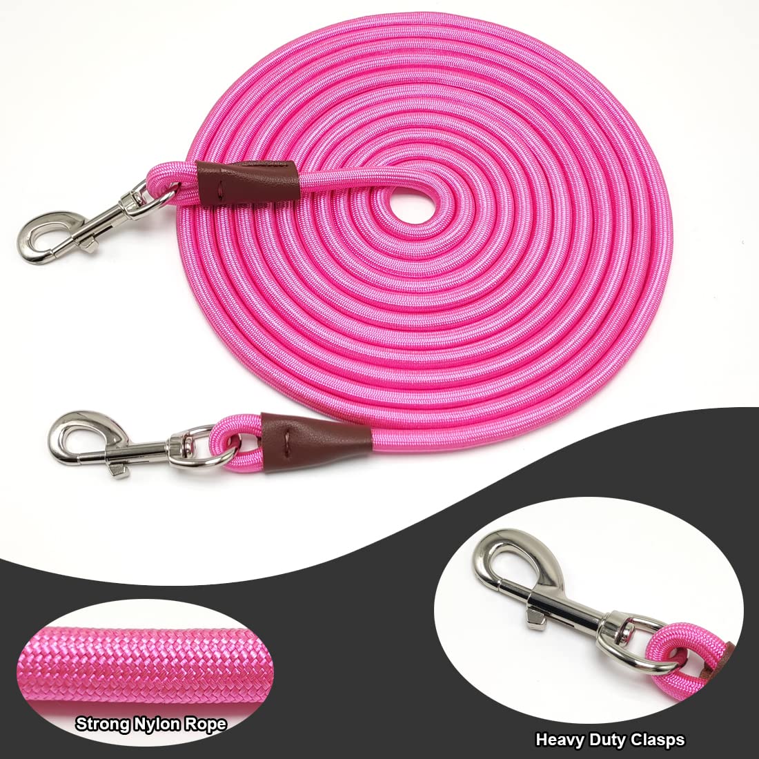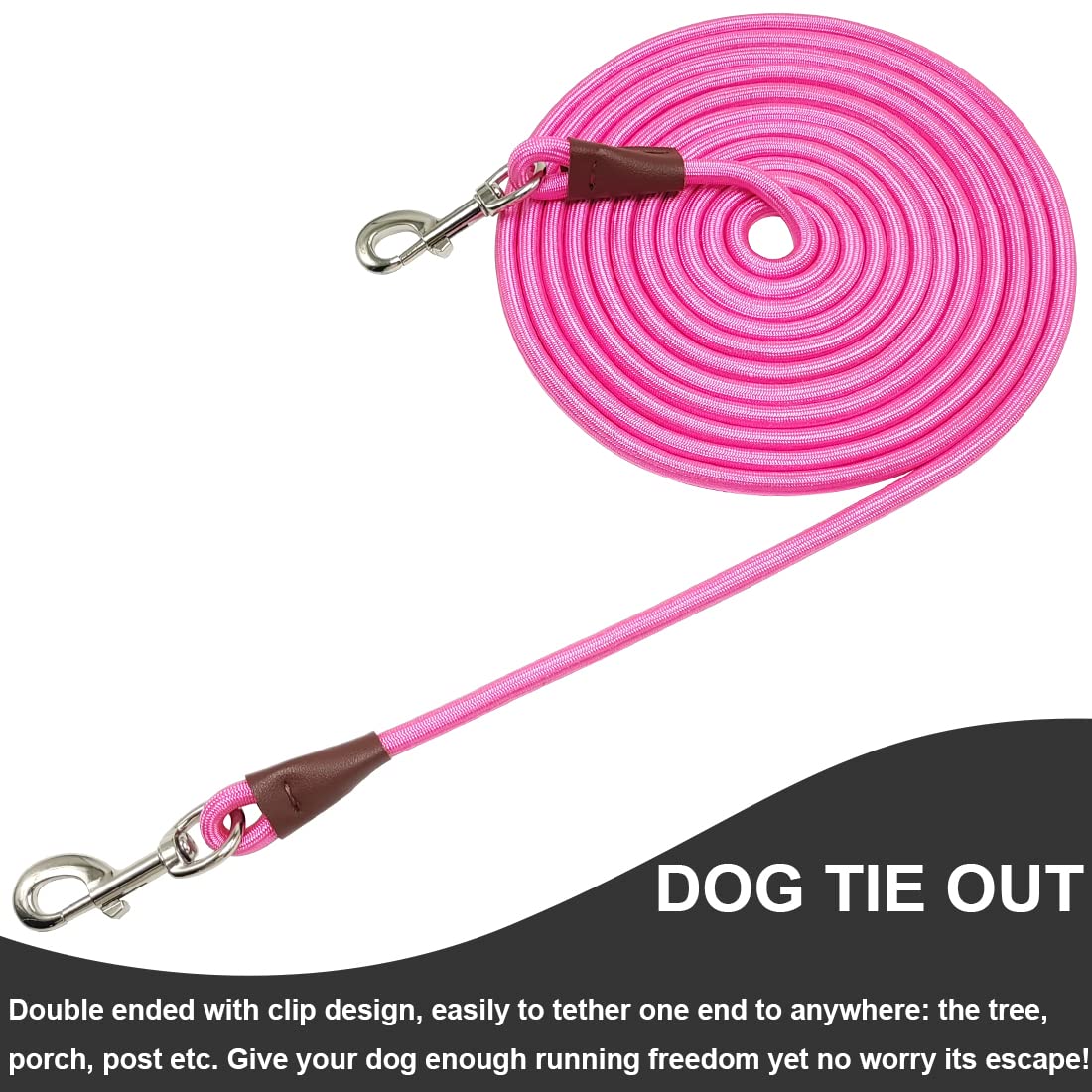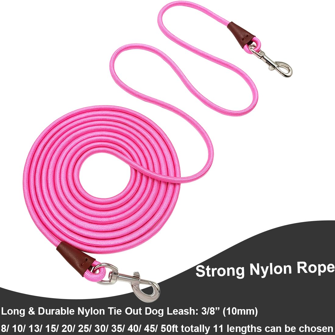 Material: Strong Nylon Rope, Heavy Duty Hook Size/ Color: Black: 8-10-13-15-20-25-30-35-40-45-50 Ft And Blue, Pink: 8 Ft, 10 Ft, 15 Ft, 20 Ft, 30 Ft 8 Ft | 10 Ft | 13 Ft | 15 Ft: Perfect For Daily Walking, Hiking, Give Your Dog Freedom While Keeping Within Reach. 20 Ft | 25 Ft | 30 Ft: Close Ball Play, Using The Potty With Freedom And Play Backyard. 35 Ft | 40 Ft | 45 Ft | 50 Ft: Recall Training, Outdoor Play, Swimming, Freedom To Run, Or Off-Leash Training. Heavy Duty Training Rope: It Is Made Of Extra Strong Nylon And 360 Rotation Metal Hook And Easy To Open And Close. Two Ended Clasps: Whether You Are Out Camping, Or You Do Not Have An Enclosed Courtyard, Your Pets Still Have Opportunity To Run And Play Around Without Being Tethered To Your Hand.Comfort: Our Leash Is Sturdy And Durability, Light In Weight, So Your Dog Won'T Feel Bulky Or Any Uncomfortable. It Allows Dog For More Wandering Area And Freedom, What'S More It Is Enough To Track The Pet'S Movements Within The Line Of Sight And Prevent Pets From Getting Lost Dog Tie Out/ Check Cord Long Dog Lead Is A Great Tool For Exercising And Training Dogs, Lightweight But Sturdy And Durability, Easy To Carry And Multi-Functional. These Long Rope Leash Has Heavy Duty Hooks On Both Ends. 360 Degree Swivels To Resist Twisting. It Works Great As A Dog Tether To Tie Out It To A Tree Or Railing; Used As A Clothesline; It Also Works As A Bundling Rope, Luggage Strap, Etc