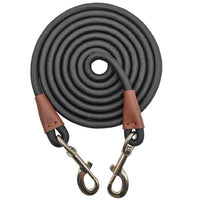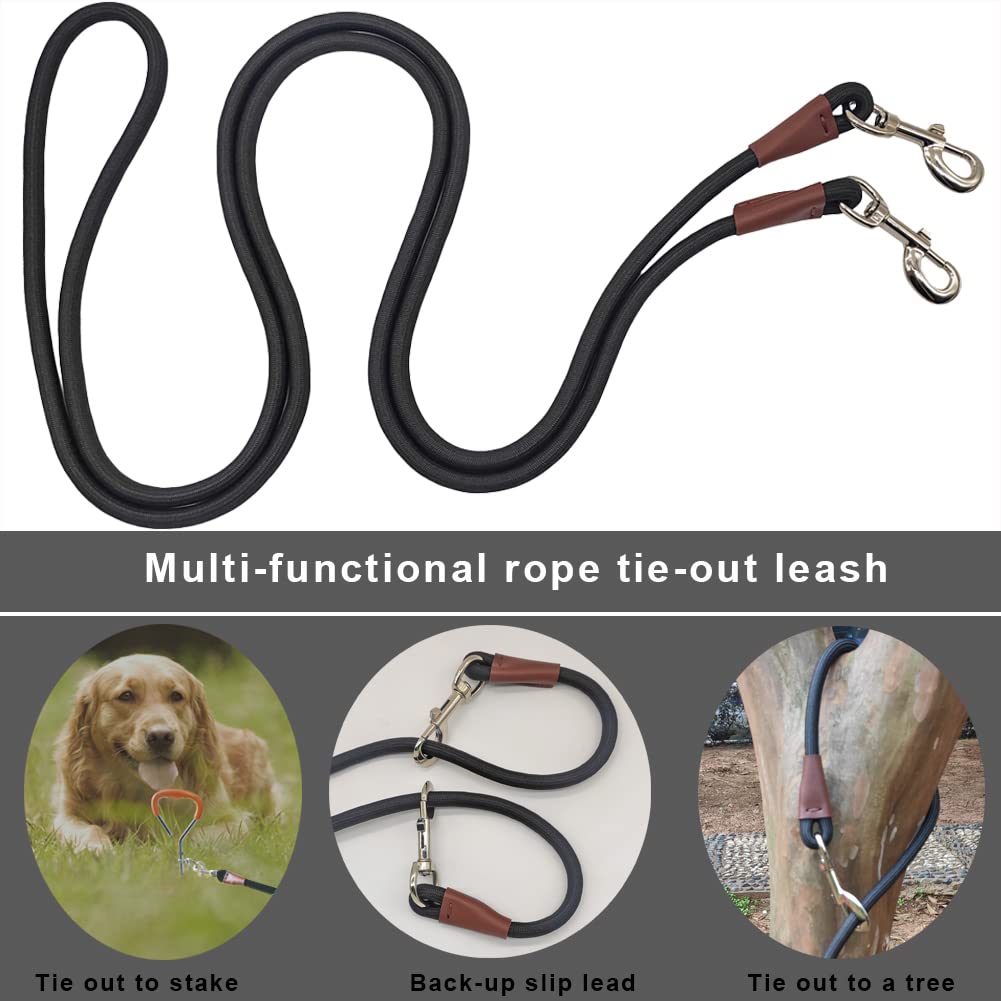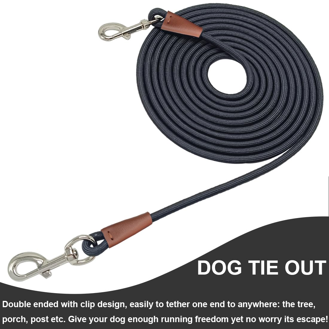 These long rope leash has durable hooks on both ends. 360 degree swivels to resist twisting. It works great as a dog tether to tie out it to a tree or railing; used as a clothesline; it also works as a bundling rope, luggage strap, etc