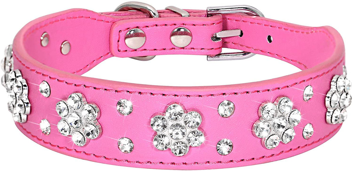 Serijoars Rhinestone Dog Collar - Cute Flower Rhinestone Bling Collar, Pu Leather, Adjustable Sizes Xs, S, M (Hot Pink)