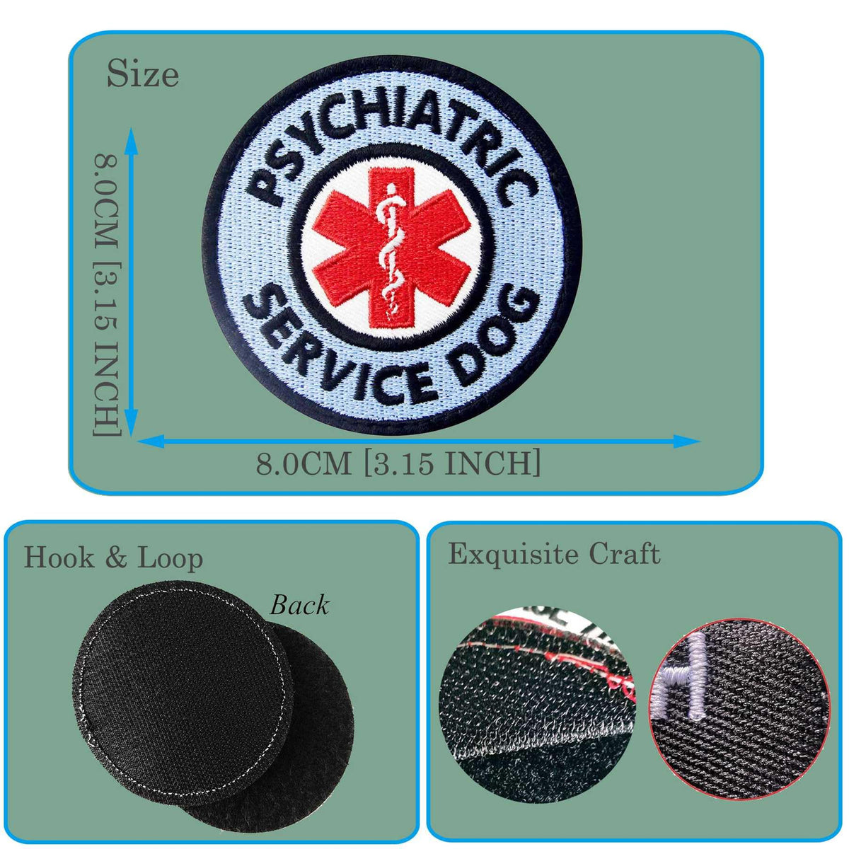 Q: What size is the Service Dog Patch?A: The Service Dog Patch has a diameter of 8CM, making it suitable for both small and large dog vests and harnesses.