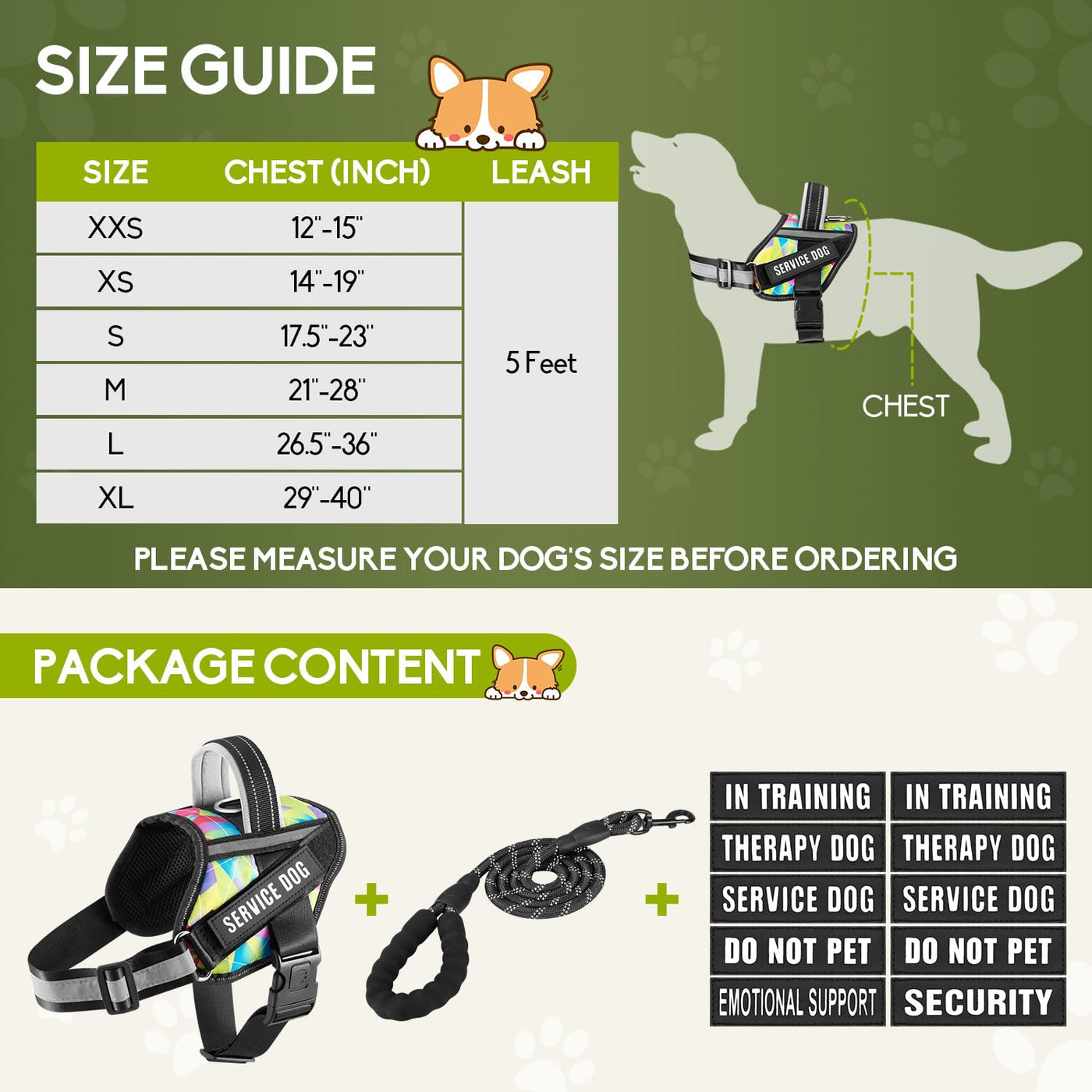 ?What Will You Get?The package comes with a service dog harness a 5-feet dog leash 10 bright dog patches such as ''DO NOT PET '' ''IN TRAINING '' ''SECURITY '' ''THERAPY DOG '' ''SERVICE DOG