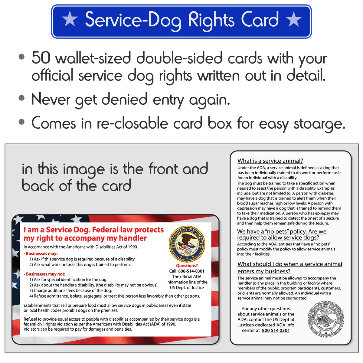 SERVICE DOG ACCESSORIES. REFLECTIVE DOG HARNESS - comes in many sizes, for all breeds of dogs (size is measured at chest/girth). Made of durable, yet comfortable material. Includes a handle for a hand and a metal ring for a leash. It includes a removable patch that says SERVICE DOG. The patch has hooks and loops and can be replaced with other patches easily. 2) Box of 50 high-quality ADA service animal information service dog cards to give to any establishment that denies your right. Comes in box that's reclose-able so the cards wont get ruined. Fits into any wallet or pocket (same size as business cards) 3) Metal ID tag that identifies your service dog . Made of durable material. Engraved on both sides