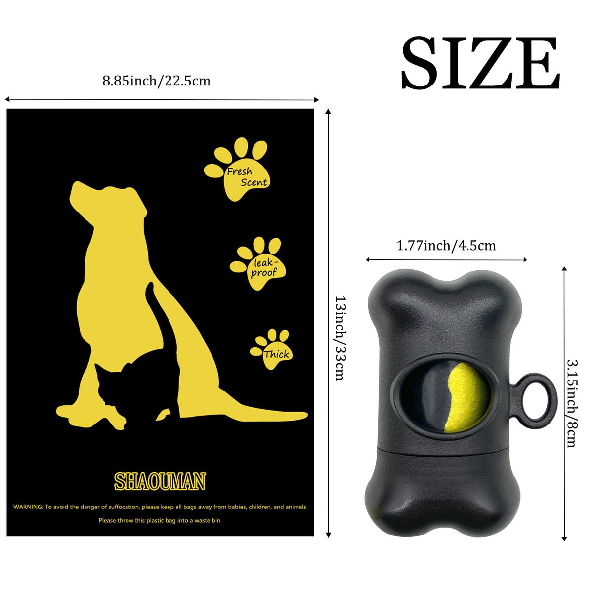 Q: What are the dimensions of the poop bags and the holder?A: The size of each dog waste bag is 23x33 cm (9x13 in), while the holder itself measures 7.5x4.5x4 cm (3x1.8x1.6 in), making it compact and easy to carry.