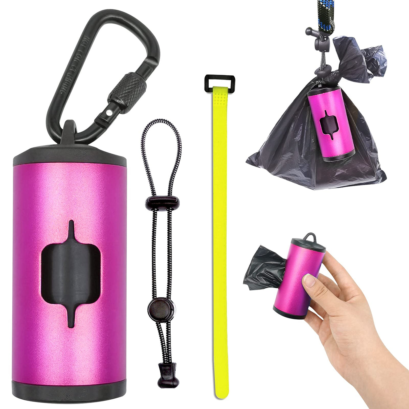 Top Quality Material:aluminum alloy body with best coating craft shiny color and scratch resistant much more durable than most regular plastic dog poop bag dispensers Upgraded Top and Bottom: made of ABS+Pc material with upgraded deeper and longer thread close tightly and wont fall apart any more Upgraded Keychain with Lock as Leash clip:aluminum alloy keychain with lock best quality on market for hooking dog leash poop bag holder it wont fall off leash or lead no matter how fast the pets and owners run You can enjoy your walk and jogging without worrying dog poop bag holder lost Simple Design with Modern Look:functional and practical 6 classic colors available for choiceLeak-proof Unscented Black Bags: made with neat break points Measures: 32*23cm13*15in standard size to fit most dog poop bags with dispenser What you get:1 doggy poo bags dispenser with 15 black unscented leak-proof poop bags 3 leash accessories:1 keychain with lock 1 elastic cord for hanging used doggie poo bags and 1 hook and loop fastener for dog walking