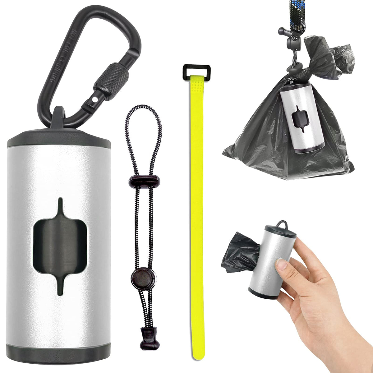 Shaouman Metal Dog Poop Bags Holder Aluminum Poo Bags Dispenser With 15 Black Unscented Pet Waste Bags And 3 Leash Accessories For Dog Walking(1 Holder 15 Bags,Silver)