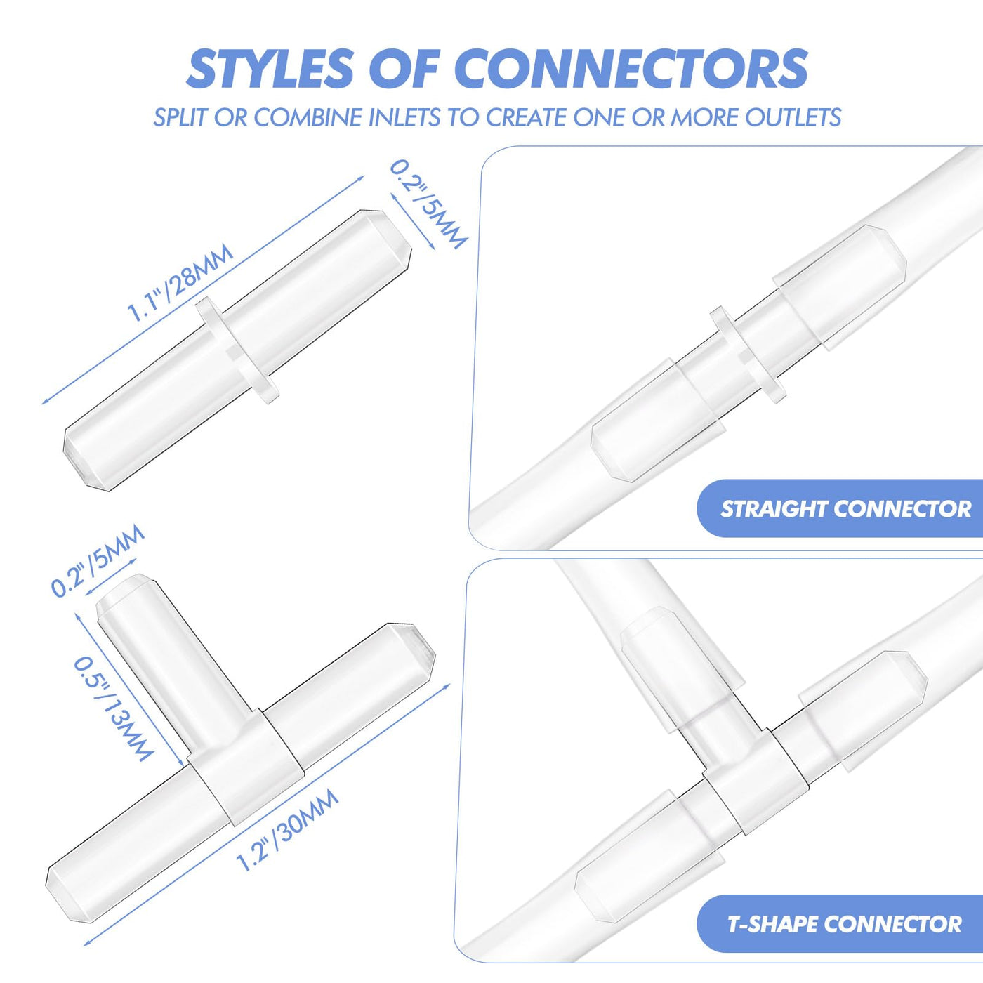 Q: How do I install the T-connectors and straight connectors?A: The T-connectors are used to combine two inputs into one output, making them convenient for dual outlet pumps. The straight connectors are designed for mending or extending the airline tubing. Simply insert the ends of the tubing into the connectors and ensure a secure fit for optimal performance.