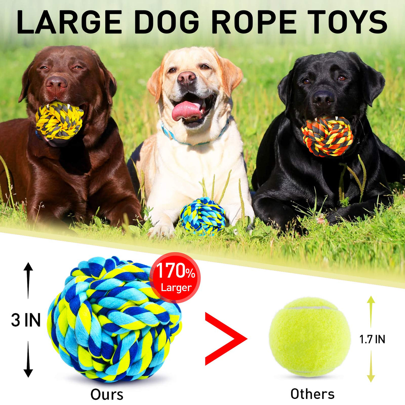 Dog Rope Toy For Aggressive Chewers And Tug Toy For Dogs Dogs love game of fetch or tug of war, the rope dog toys for aggressive chewers long lasting are perfect for any sized dog. High quality cotton rope for dogs, safe and heavy duty dog toys for aggressive chewers to play with owners and other dogs and chew toys for medium dogs. The dog tug toys for large dogs comes in 5 different sizes and shapes offer a simple and fun solution for inappropriate chewing, reduce anxiety and bored, super chewer dog toy large breed, great as oversized xl dog toys bulk for pitbull toys, german shepherd toys as indoor and outdoor dog toys. Package Include 2 x Five Knots Dog Rope Toys 2 x Three Knots Dog Rope Toys With Handle 2 x Two Knots Dog Rope Toys 2 x Rope Balls 1 x Tug Of War Rope Ball