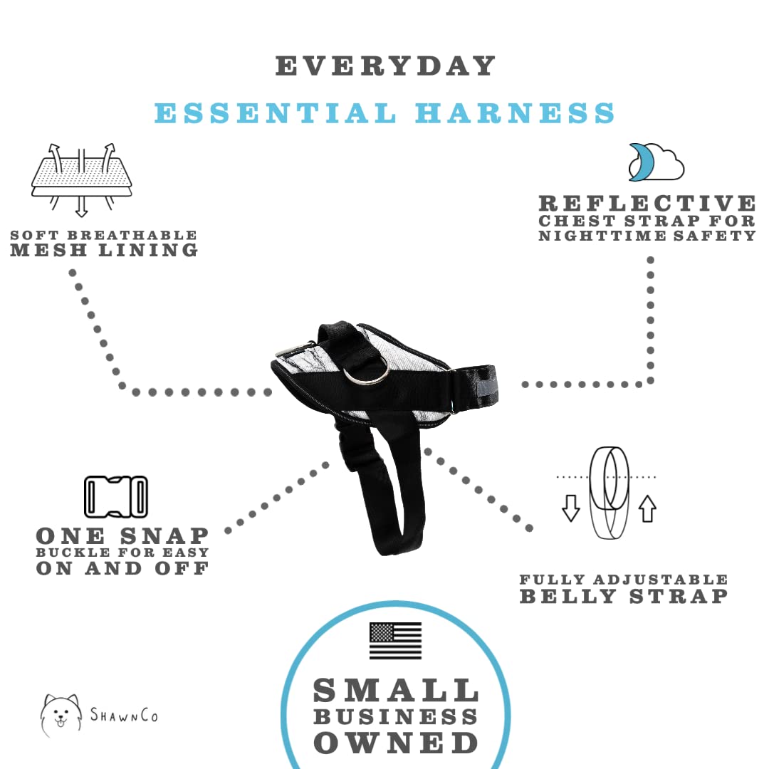 SHAWNCO Essential harness makes it simple to take your dog on daily walks and adventures. Sturdy design means it can withstand daily wear and is designed to be the only harness you'll need. Fully adjustable chest and belly strap allow you to find the perfect fit for your dog regardless of size and body type. 3 ring design gives the option to use the side rings to help to discourage your dog from pulling while walking. Nothing is more important than your pets safety so our harness features a reflective chest strap and outer trim to keep your dog safe anytime, day or night. Our Essential harness helps to eliminate the strain on your dogs neck when they pull, preventing choking and potentially serious health problems. Our harness is vet recommended and the best option to help you and your dog enjoy the best walking experience possible!