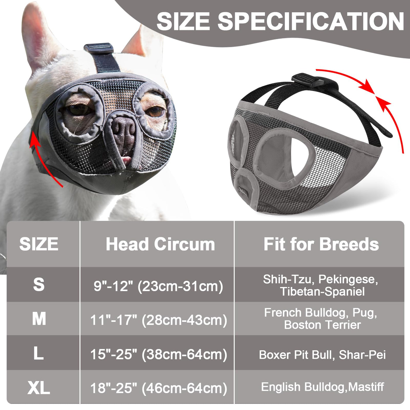 Short Snout Dog Muzzles- Bulldog Muzzle Breathable Mesh Dog Mask For Biting Chewing Training Licking Grooming (Gray, L(Head 15.1