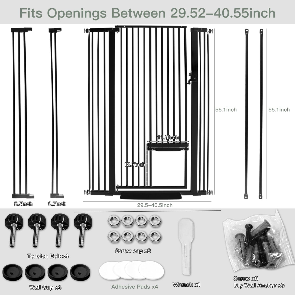 Ensure the safety and freedom of your beloved feline companion with our 55 inch Extra Tall Cat Gate. Standing taller than conventional gates, this fortress-like barrier ensures your cat stays secure. Ideal for families with children and multiple pets. The small pet door can be adjusted up and down and locked, which is convenient and practical.