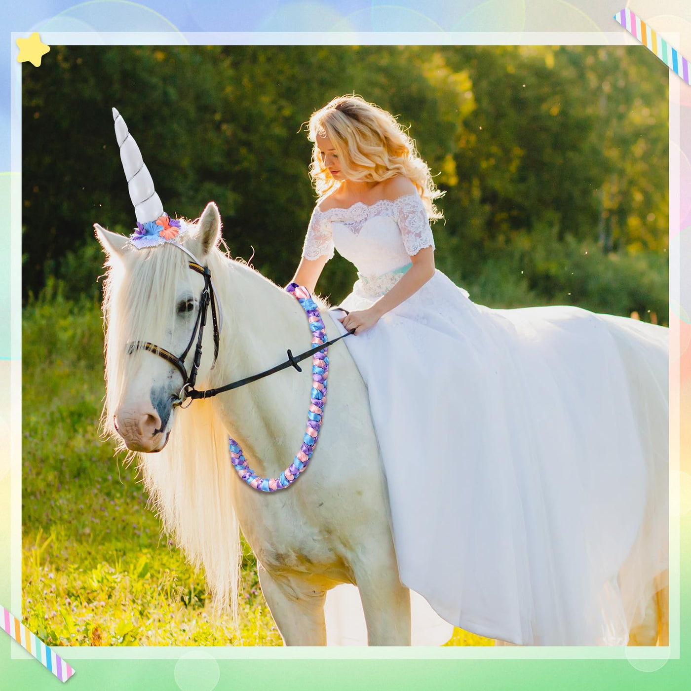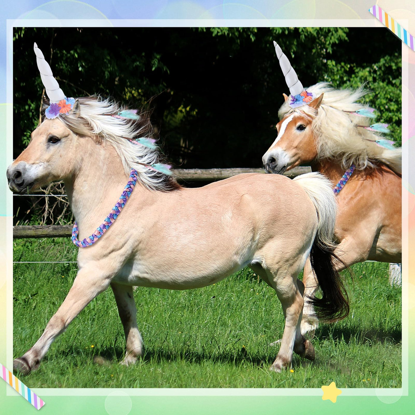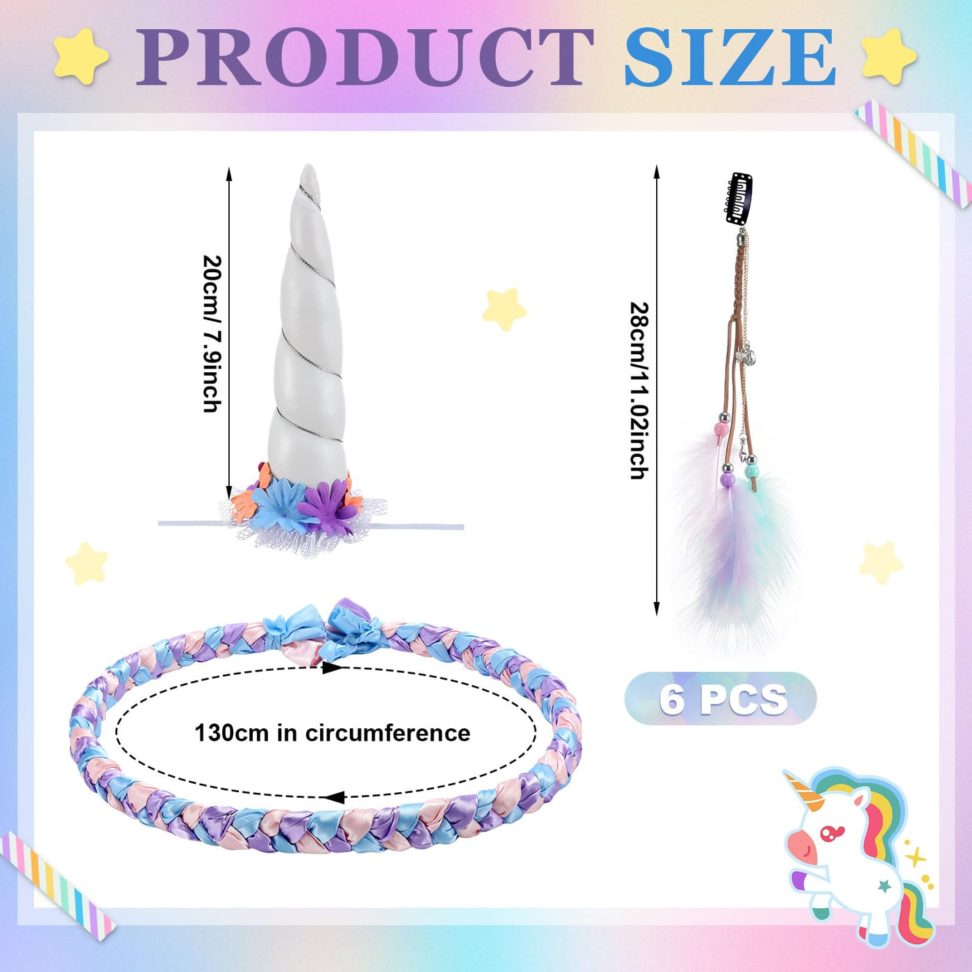 Features: Whether its a competitive event, a lively party, or a majestic wedding, using our horse horn, hair tinsel feather clips, and flower vine, your horse is sure to steal the show. These quality hair braiding accessories ensure head turning style for your horse on most occasion, making it the sought-after horse accessory in many events This set instantly turns your horse into a magical, mythical creature. Ideal for making a striking impression at parades, shows, and photoshoots Specifications: Material: Color: color of macaron Size: 7.87 inches horse horn 17.72 inches elastic rope Package includes: 1 Pcs horse unicorn horn 6 Pcs horse feather clip 1 Flower headband spiral horn Notes: Manual measurement, please allow slight errors on size. The color may exist a slight difference due to different screen displays.