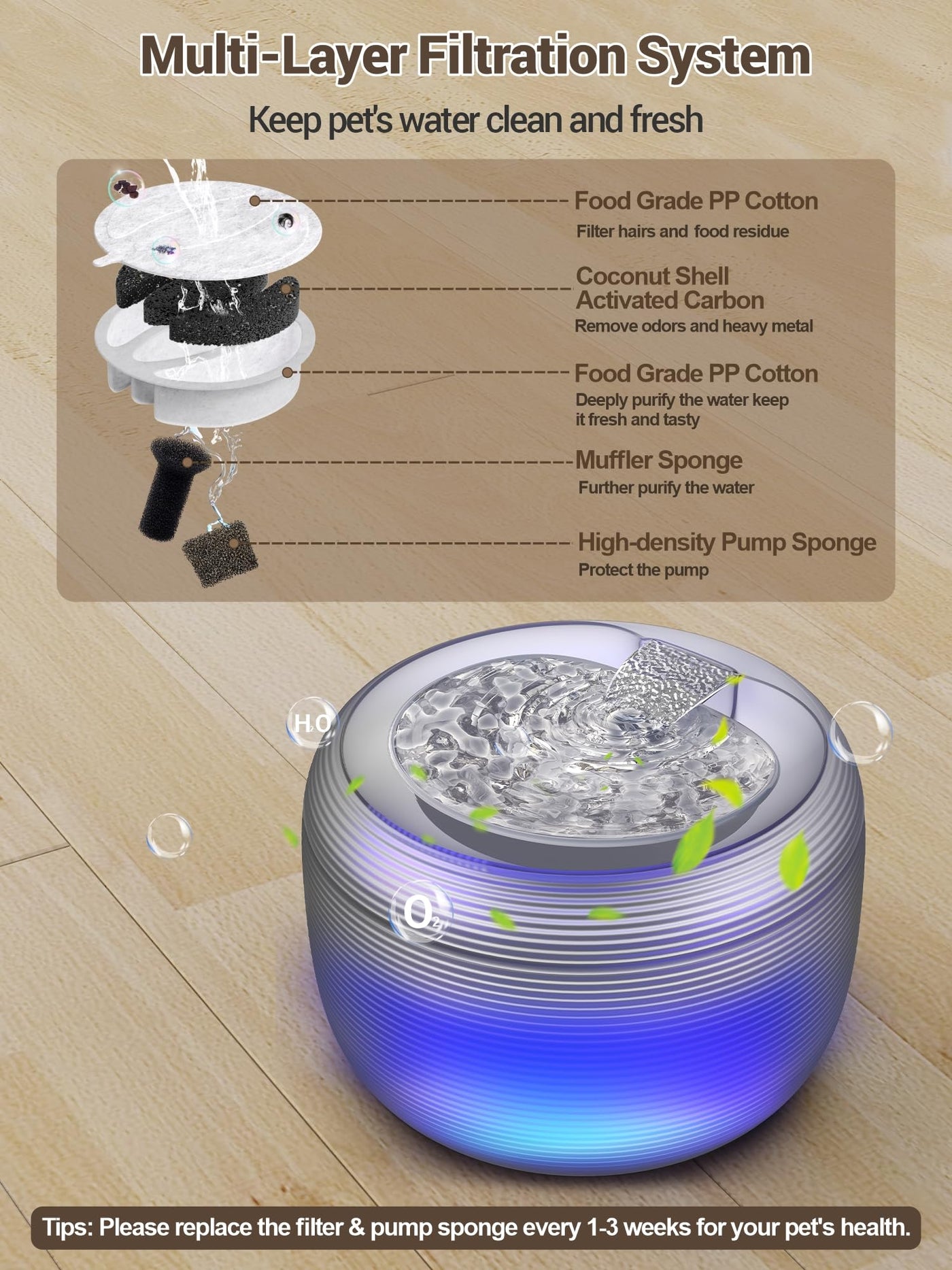 Worry less about your furry friend running out of water. The cat drinking fountain features a large capacity water tank to help your reduce your frequency of water replenishment, ensuring your pet are hydrated.