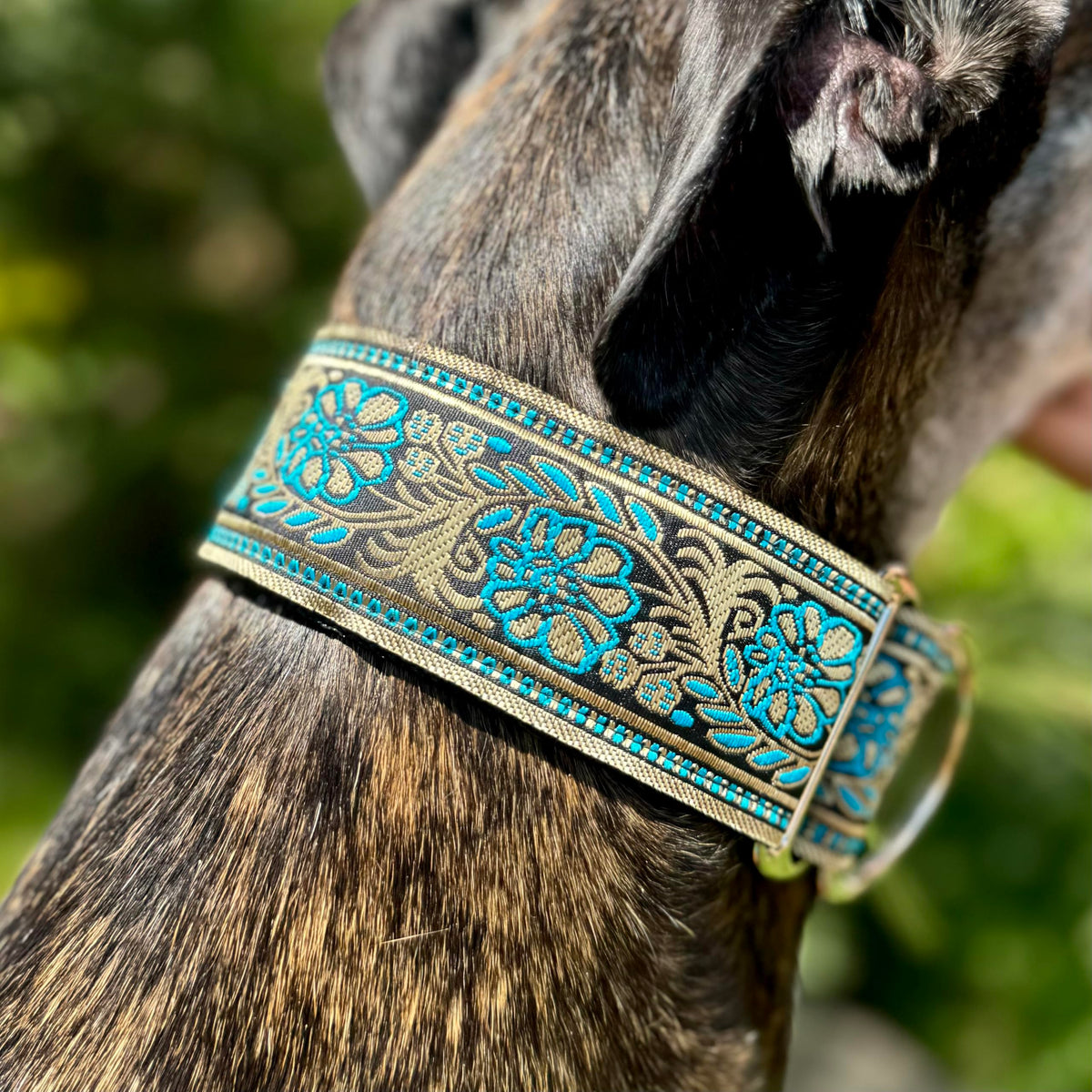 Beautiful handmade Martingale Greyhound/ Saluki/ Whippet dog collar 2'' wide good quality welded metal fittings M 11''-14'' L 14''-18'' Please measure your dog neck before ordering -Narrowest part of your dog's neck which is behind the ears -The widest part of the head (circumference of the head) Please see my other items