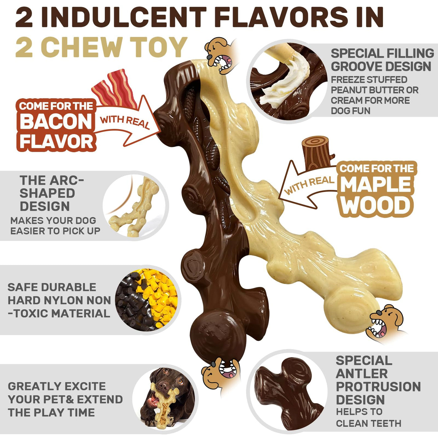 Q: What are the scents used in the SIHRMIU Dog Chew Toys, and do they enhance playtime?A: The SIHRMIU Dog Chew Toys come in two enticing scents: a crispy bacon aroma for the brown toys and a woody scent for the beige toys. These scents are infused during the manufacturing process to attract your dog and encourage extended playtime.