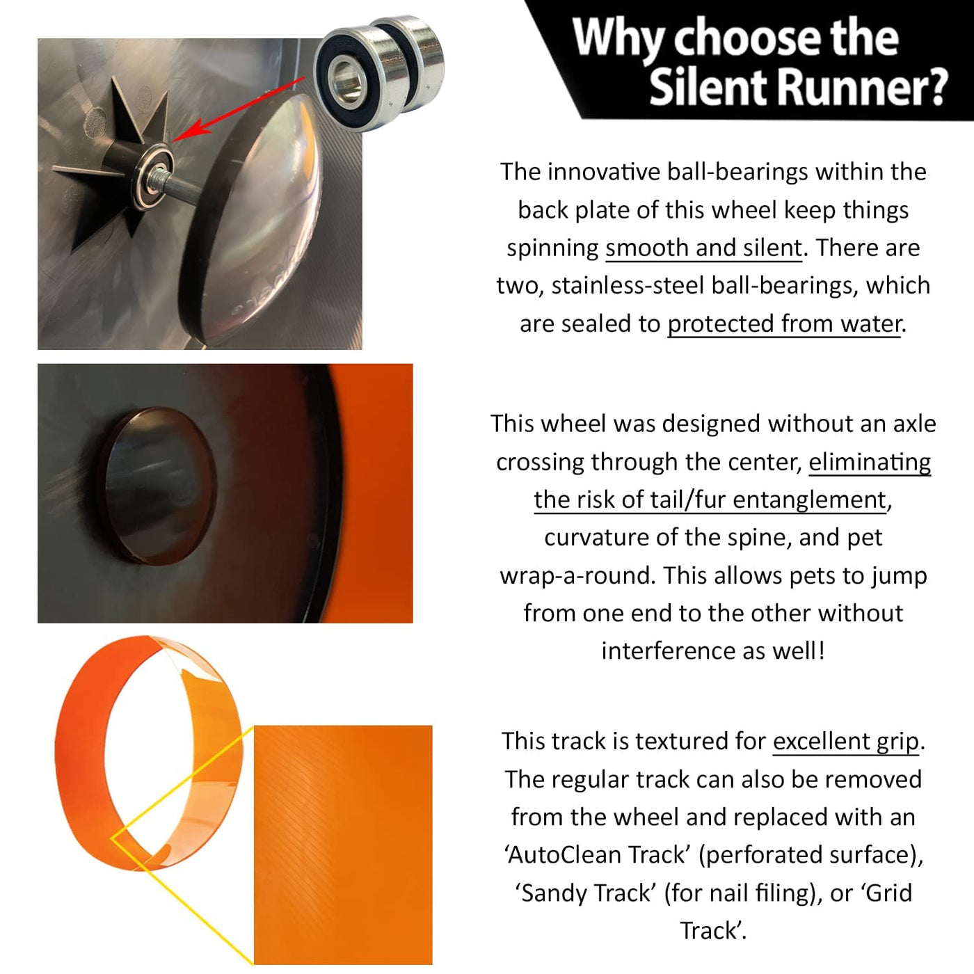 Q: How does the axle-free design improve safety for my pet?A: The axle-free design of the Silent Runner wheel eliminates the dangerous center bar, reducing the risk of fur or tail entanglement and preventing injuries related to spine curvature. This feature enhances the overall safety of your pet while they exercise.