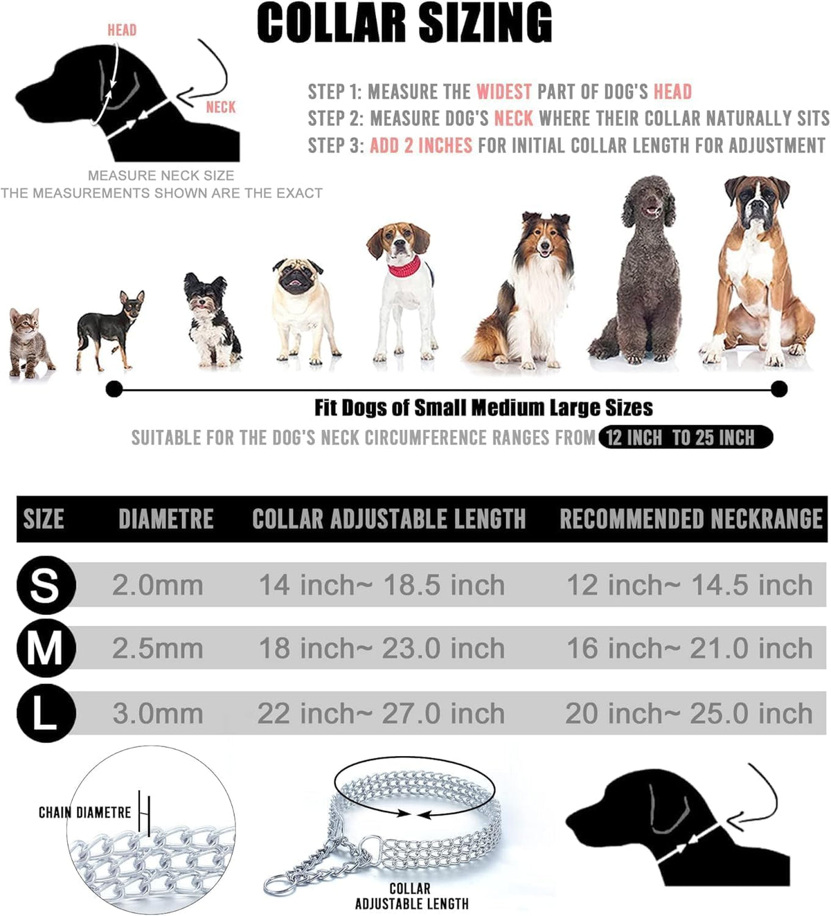 ?Size? S Length 16-Inch For Dog'S Neck Max 12-Inch, Link Diameter 2.0Mm.Weight About 80G. M Length 20-Inch For Dog'S Neck Max 16-Inch, Link Diameter 2.5Mm. Weight About 150G. L Length 24-Inch For Dog'S Neck Max 20-Inch, Link Diameter 3.0Mm.Weight About 252G. Package Included: 1*Dog Choker Collar Noted: Please Measure The Length Of Your Dog'S Neck Before Ordering. You Can Buy Bigger One Size.If Your Dog Has A Large Head, It Is Recommended To Buy Bigger Size. ?Durable And Rust-Free?The Choke Dog Chain Collar Made Of Alloy Steel And Chrome Plating, Won'T Become Rust And Tarnish Over Time. Simultaneously It'S Sturdy Enough To Hold Your Do, Yet Light Enough For His To Pick Up Your Cues For His Behavior. ?Functional Chain Dog Choker Collar?The Metal Chain Dog Collar Can Exert Control Over The Dog In A Short Period Of Time With Less Force, Correct The Dogs Wrong Habits. Use It Responsibly To Let Your Dog Become A Member Of Your Family Faster. ?Durable And Rust-Free?The Choke Dog Chain Collar Made Of Alloy Steel And Chrome Plating, Won'T Become Rust And Tarnish Over Time. Simultaneously It'S Sturdy Enough To Hold Your Do, Yet Light Enough For His To Pick Up Your Cues For His Behavior.
