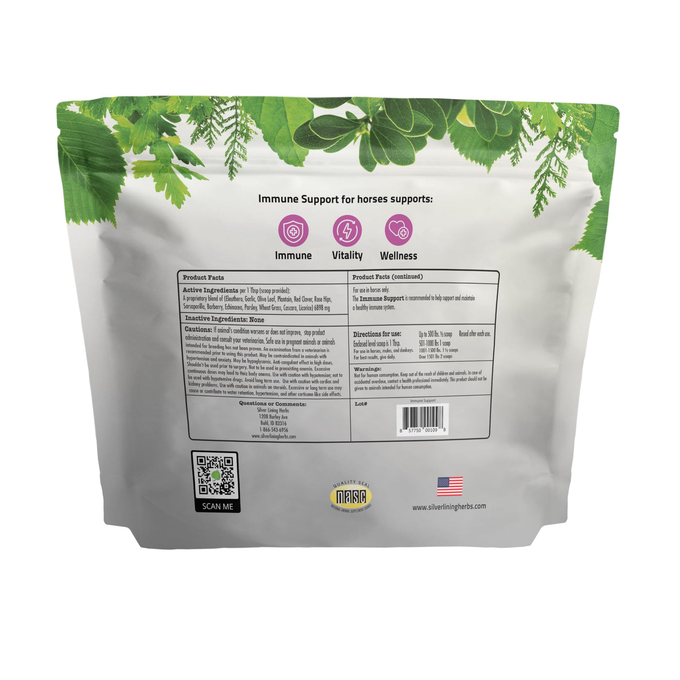 Silver Lining Herbs Immune Support Elements of foods and that are not used need to be evacuated from the body, which a healthy immune system is able to do via the liver, kidneys, blood, etc. Immune Support helps the immune system, which may aid in clearing up a wide range of seemingly unrelated issues. This product may be beneficial in: Maintaining normal fluid balance in the blood and tissues Helping achieve a healthy coat Supporting a normal stamina and endurance Supports a normal appetite and healthy weight Pronounced abnormal wrinkles over eyes Helping those with seasonal allergies RECOMMENDED USE We recommend 1 level scoop per day for 1000-1200 lb horse. There are approximately 300 scoops per 5 lb bucket. FEATURES 5 lb Resealable Bucket Scoop Included Veterinarian Recommended ABOUT US Today, Silver Lining Herbs is a world leader in natural herbal support for horses, dogs, and humans, with tremendous sales growth as word has spread of the effectiveness of Silver Lining Herbs. Yet, it remains a family-owned company, with a passion for helping people take optimal care of their animals for both health and performance. This ethos has its roots with Lavern Young, father of Silver Lining founder Mickey Young. A cattle rancher and range rider for the Bureau of Land Management for over 20 years, Lavern grew up in close proximity to the Navajo Indians, from whom he learned a great deal about medicinal herbs and their beneficial uses for both human and animal. All of these life experiences came together to form a commitment to seeking health naturally, a commitment shared by his wife Ruth Young, who became an herbalist in her own right, respected throughout the community for the quality of the herbs and advice found at her store.