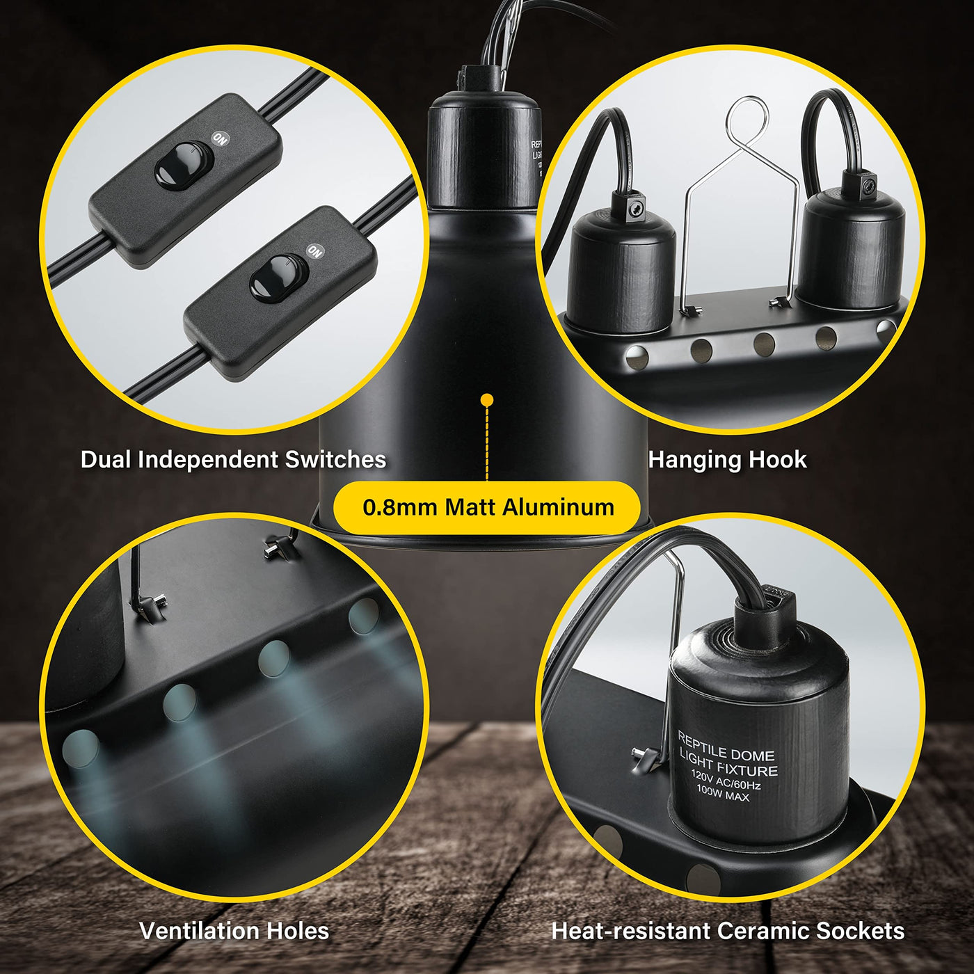 Simple Deluxe Dual Dome Reptile Light Fixture With Separate Switches, Fits Max 100W Reptile Heat Lamp/Uvb Light, For Amphibians Terrarium And Tortoise Habitat