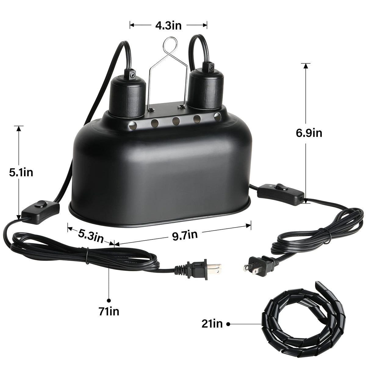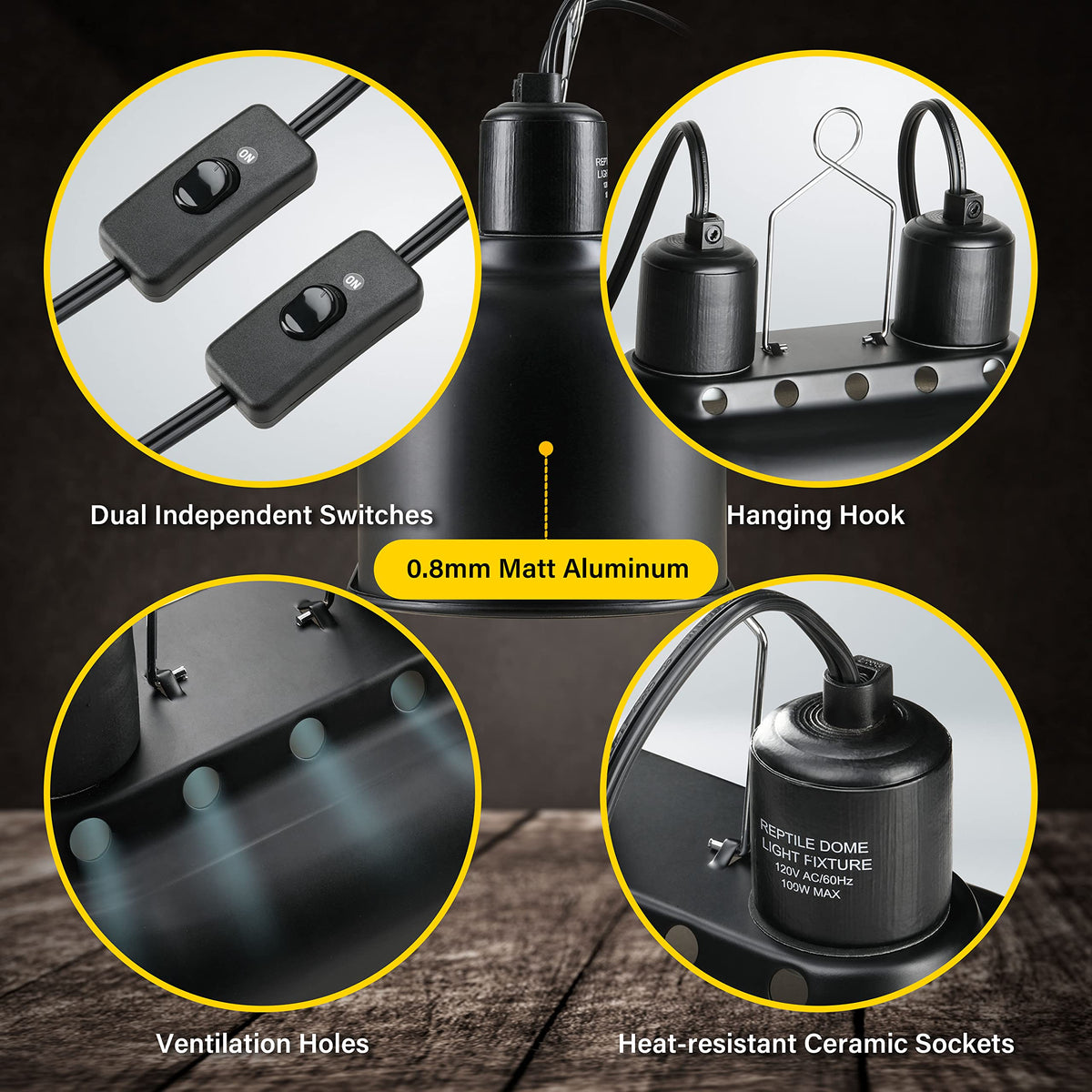 Simple Deluxe Reptile Lamp Fixture Dome Light Dual Integration Design Deep Cap Combo Heat-Lighting Lamp Double Sockets Bulbs Holder with Independent Switches for Amphibians Terrarium Turtle Tank