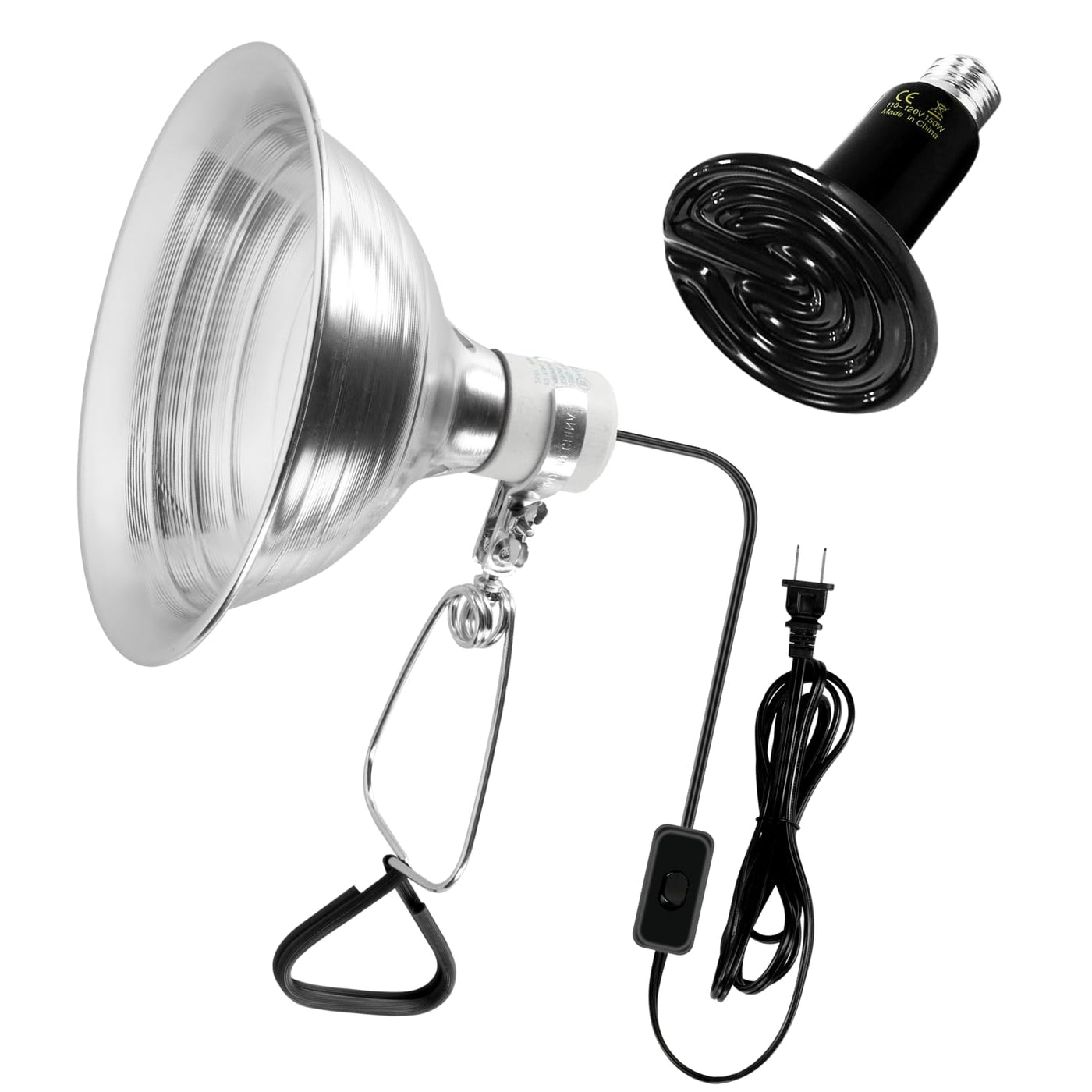 Infrared Ceramic Reptile Heat Bulb:Specifications:Socket: E26;Volt: Ac 110-120V;Watts: 150W;Material: Ceramic, Nicral;Diameter Of Heating Surface: 85Mm;Note: 1. Lamp Surface Temperature Is Too High, Do Not Directly Touch During It Works; 2. Before Remove It From Fixture, Please Allow At Least 1 Hour For Cool To Avoid Scald ; 3. Accidents May Happen Due To Improper Operation So Please Use It In A Right Way And Avoid Using In Damp Environment; 4. Please Adjust The Distance Between The Lamp And The Pets, At Least 35Cm; 5. Please Away From Combustible Or Explosive Materials;Clamp Light:Specification:Volt: 120V;Watt: Accepts Up To 150W Bulb (E26);Reflector Diameter: 8.5 Inch;Cord: 6 Feet;18/2 Spt-2 Cord Clamp Light Can Also Be Used As A Table Lamp In Your Room, Garages Or Art Studios, A Work Light In Photography And Workshops, Amphibians And Reptiles Pets Terrarium Heat Lamp, And Even A Growth Light For Indoor Plants.Warning: The Power Cord On This Product Contains Chemicals, Including Lead Known To The State Of California To Cause Cancer. Wash Hands After Use.Digital Thermostat Controller:Specifications:Temperature Control Range: 40?-108F;Temperature Display Range: 32?-140F;Rated Voltage: Ac 120V 60Hz ;Max Loading: 8A 1000W ;Easy Plug-In Operation With Led Illuminated Indicator Lights & Three-Prong Ground Plug. Digital Thermostat Can Also Be Used To Control The Temperature Of Many Other Appliances As Long As They Don'T Exceed The Maximum Electrical Specifications Stated Above. Simply Place The Sensors In The Area Where The Temperature Needs To Be Controlled Plug The Appliance Into Thermostat, And Set The Desired Temperature.Abnormal Warning: 1. If Thermostat Shows ''E1'', It Means That The Actual Temperature Is Lower Than 0? Or 32?; 2. If Thermostat Shows ''E2'', It Means That The Actual Temperature Is Higher Than 60? Or 108?. 3. If Thermostat Shows ''E3'', It Means That The Temperature Sensor Is Not Working Properly. Please Re-Install The Sensor;