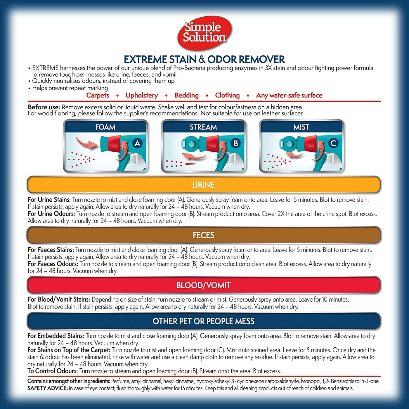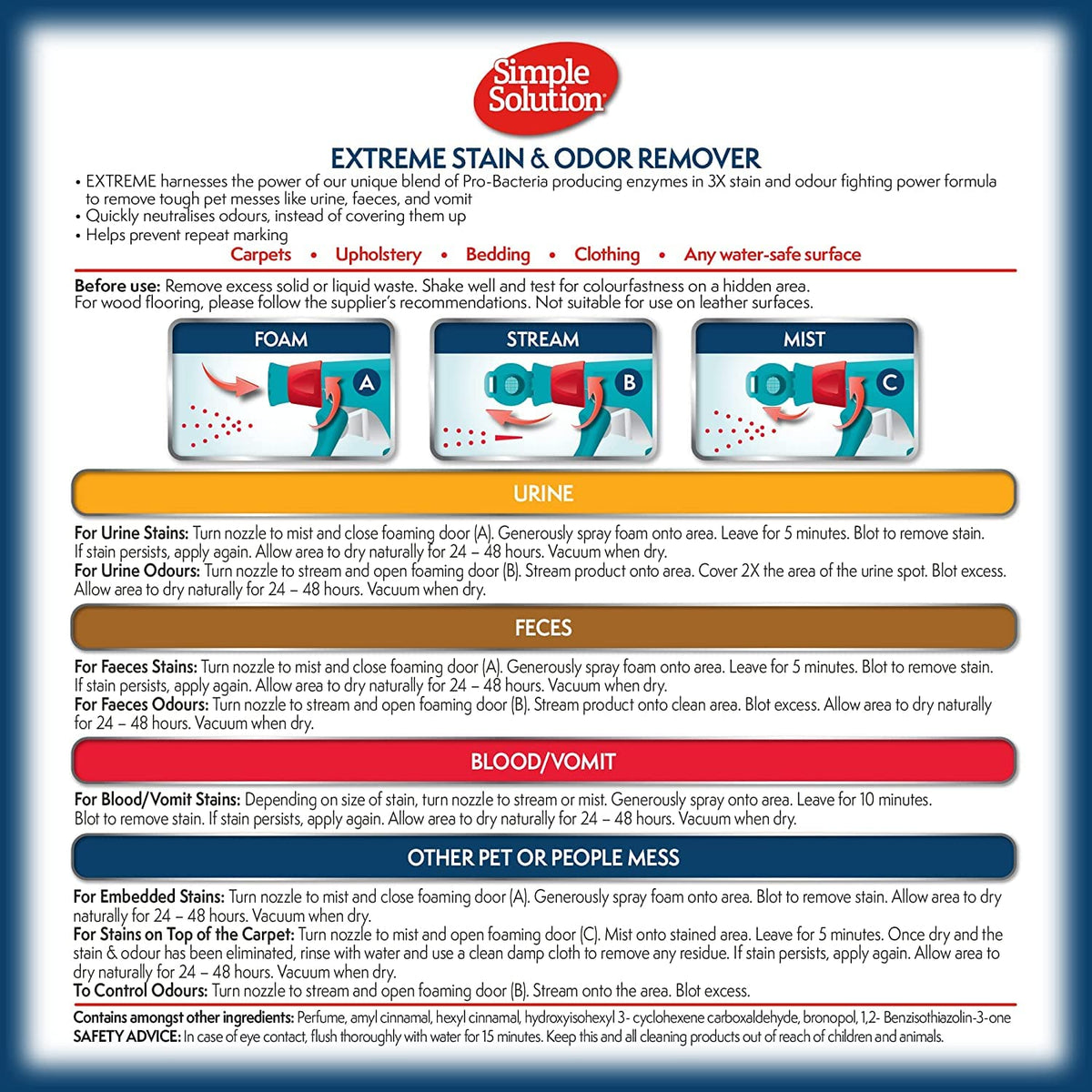 Q: How does the Simple Solution Extreme Pet Stain and Odor Eliminator work?A: The Simple Solution Extreme Pet Stain and Odor Eliminator uses a professional-strength Pro-Bacteria™ and enzyme formula that is three times stronger than regular cleaners. It breaks down and neutralizes stains and odors from pet urine, feces, and vomit, effectively eliminating them while leaving a fresh Spring Breeze scent.