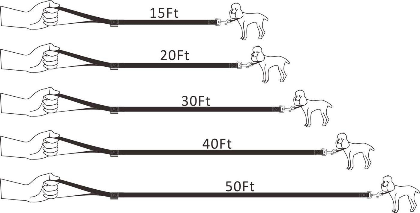 Q: What is the length and width of the Siumouhoi training leash?A: The Siumouhoi Dog/Puppy Obedience Recall Training Leash is available in various lengths, including 15 ft, 20 ft, 30 ft, 40 ft, and 50 ft. The width of the training rope is 3/4 inch.