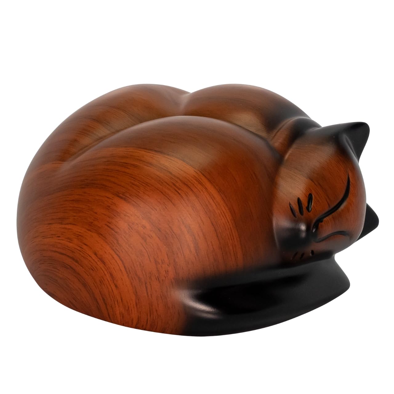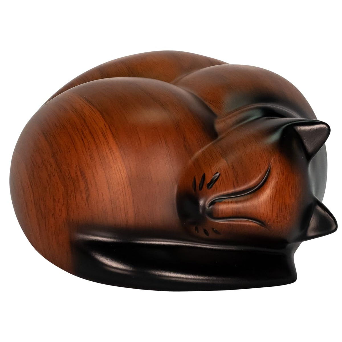 The Sleeping Cat Pet Urn Is A Precious Tribute To A Feline Friend. This Urn Is Carved From Resin Into The Shape Of A Cat With Its Eyes Closed And Tucked In A Ball. The Coloring Is A Warm Brown With Black Tips On The Cat'S Ears And Tail And Has The Look Of Wood. Made From A Resin, This Urn For Cat Ashes Is Smooth To The Touch. The Rich Woodgrain Look Adds To The Overall Warmth Of The Urn. The Carved Details Of The Face With Sweet Whiskers Will Touch Your Heart. The Sleeping Cat Pet Urn Is Approximately 7 Inches Long And 3.75 Inches High. Any Cat Lover Will Cherish This Memorial To His/Her Pet. The Urn Compartment Is Accessed From The Bottom -- Where The Bag Of Ashes Can Be Placed Inside. The Sleeping Cat Pet Urn Has A Capacity Of 43 Cubic Inches (Will Hold The Ashes Of A Cat That Weighed 43 Pounds Or Less Prior To Cremation).