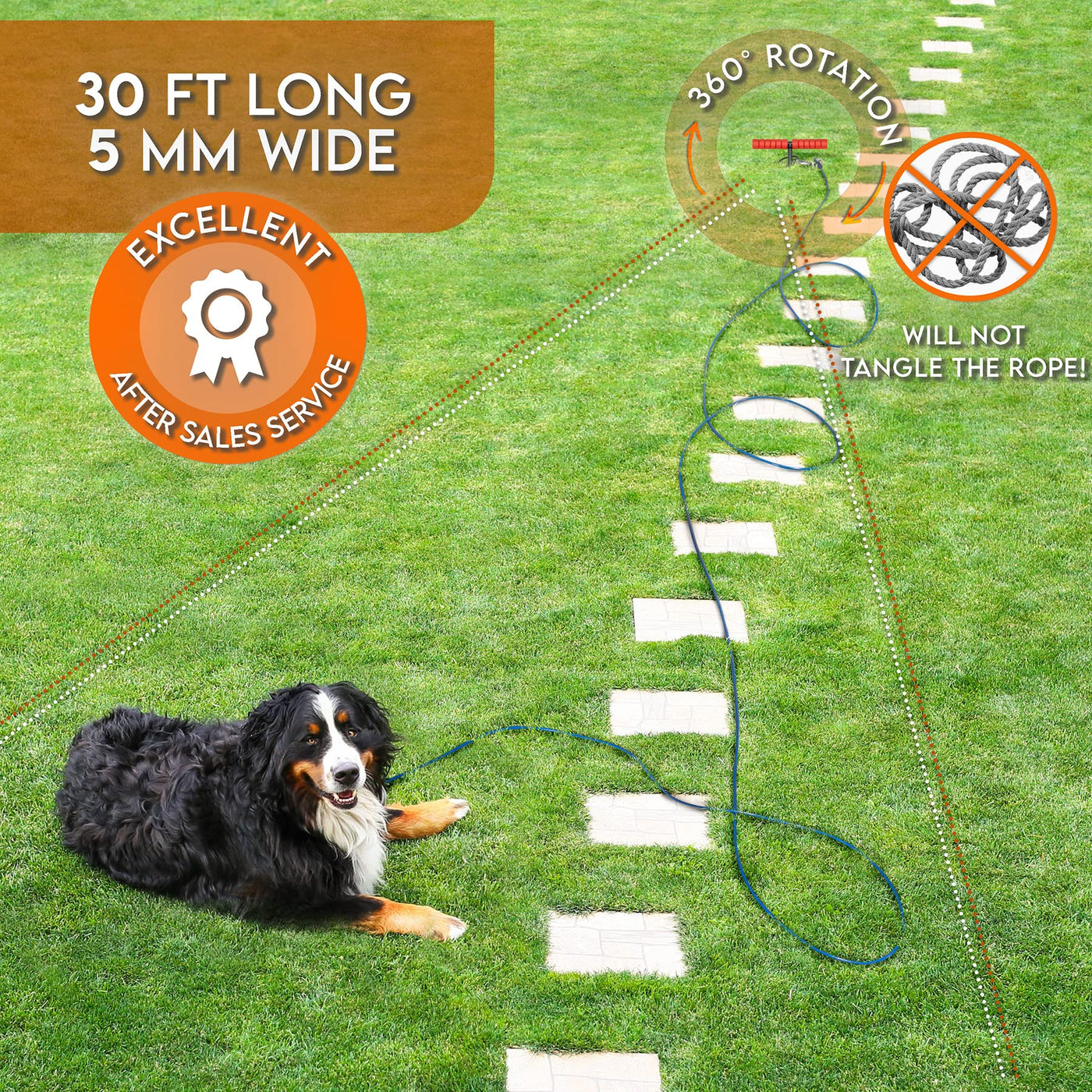 Q: Is the tie-out cable chew-proof and tangle-free?A: Yes, the Sliridog dog tie-out cable is sturdy, chew-proof, and features a 360° rotation design that prevents tangling, allowing your dog to move freely without getting caught.