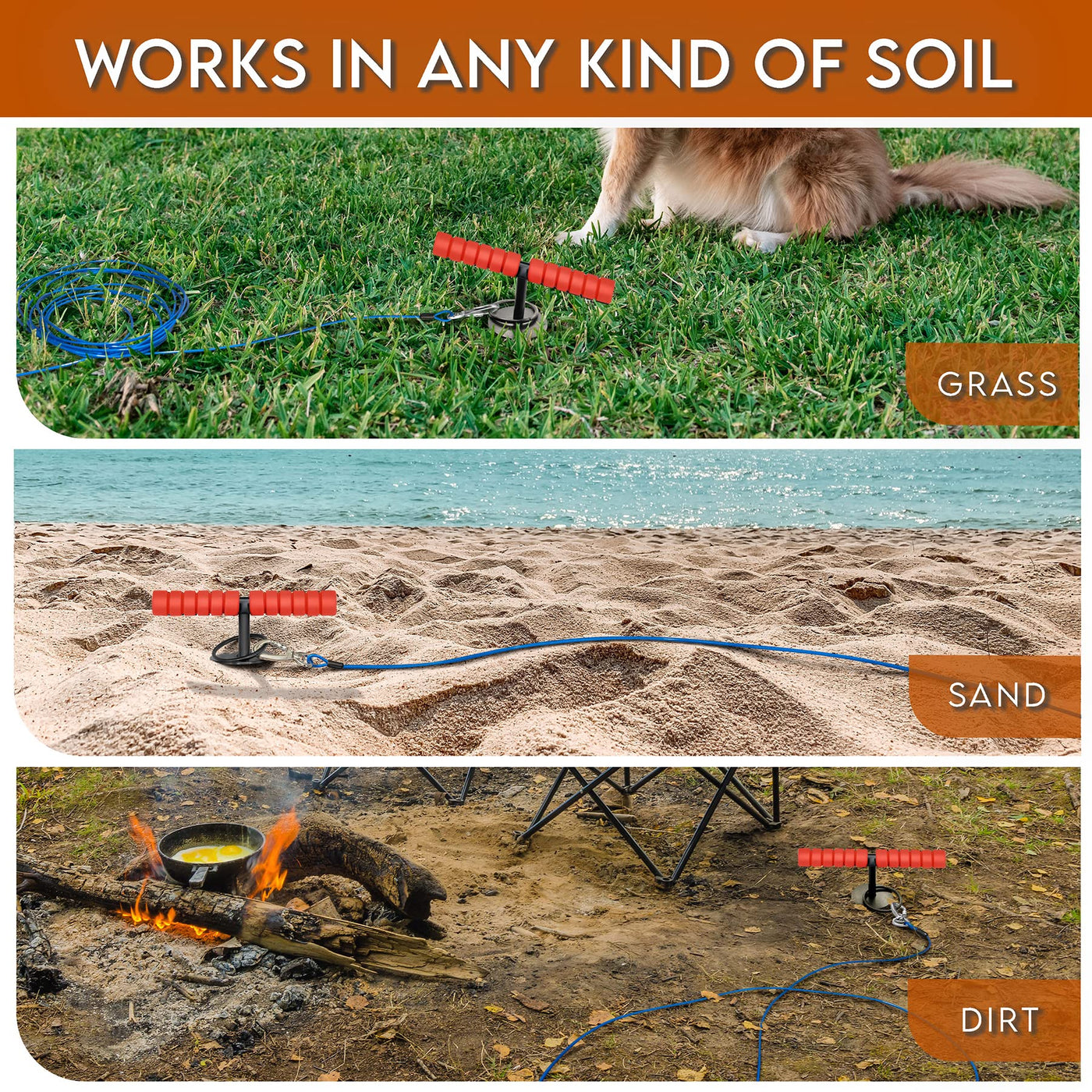 Q: How easy is it to install the dog tie out stake?A: The dog tie out stake can be easily installed by twisting it into the ground with a built-in handle. Its spiral design allows for smooth insertion into various soil types, including sandy or loose ground.