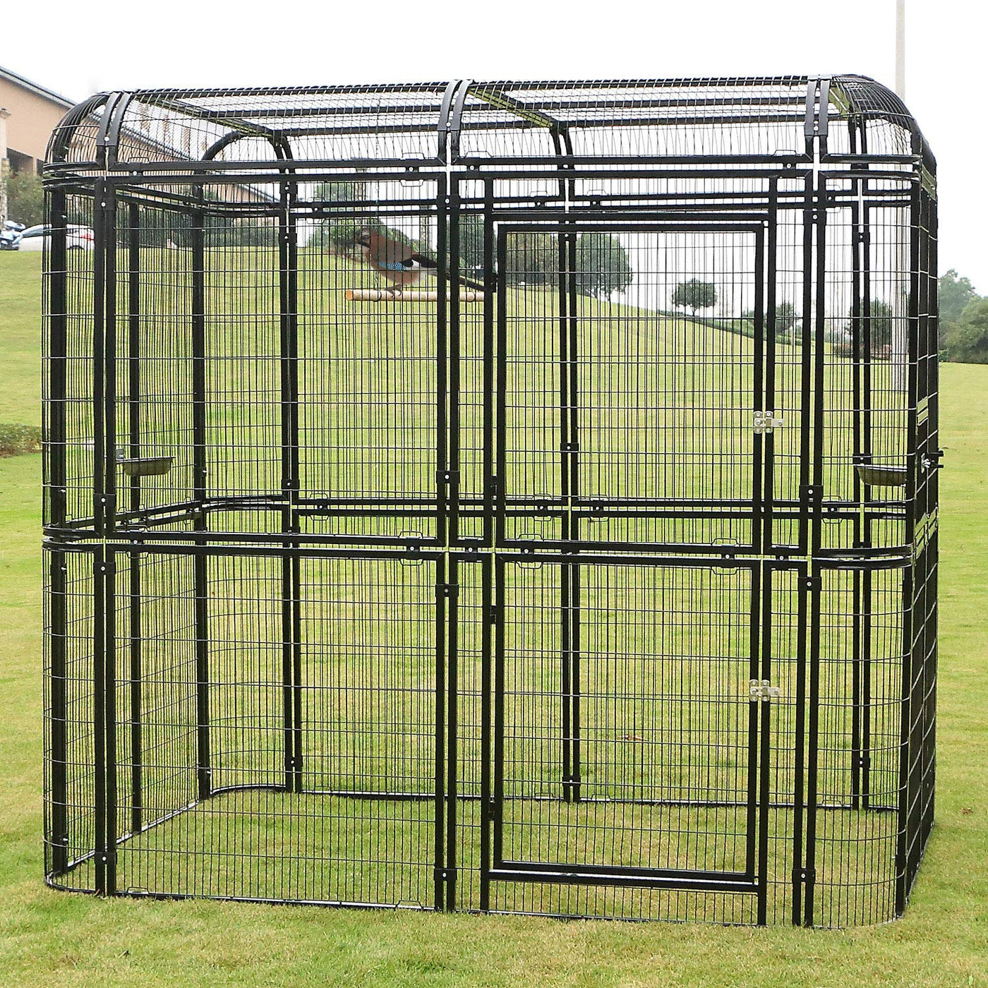 Description If you are seeking a spacious but sturdy room for your lovely birds, please take our bird cage into consideration. Durable wrought iron frame construction features excellent shock, rust, corrosion, tarnish resistance, which prolongs the service lifetime of the cage. Heavy duty protective bird cage will keep your pets safe from threatening predators while it enjoys the outdoors. All iron wire netting construction is ventilate, providing a wide sphere of vision to your birds and making them feel free. Non-toxic power coated finish can protect your birds safety. The gate is easy to open and get into for easy feeding and playing, it is also secure when in closed condition. Two stainless steel feeding bowls and three wood perches for resting are included. Specification: Material: Iron frame Overall Size: 7.2ft x 5ft x 6.8ft ( Lx Wx H ) Door size: 30.3Lx49.6H Rectangular grid: 4x0.79Feed Window size 19.29 Lx11.81 H Package in total: 3 Package 1: Size :36.6*35.4*10 inch Gross Weight:63lbs Package 2: Size :46.1*15.4*18.9 inch Gross Weight:79lbs Package 3: Size :46.1*5.9*35.6 inch Gross Weight:57lbs