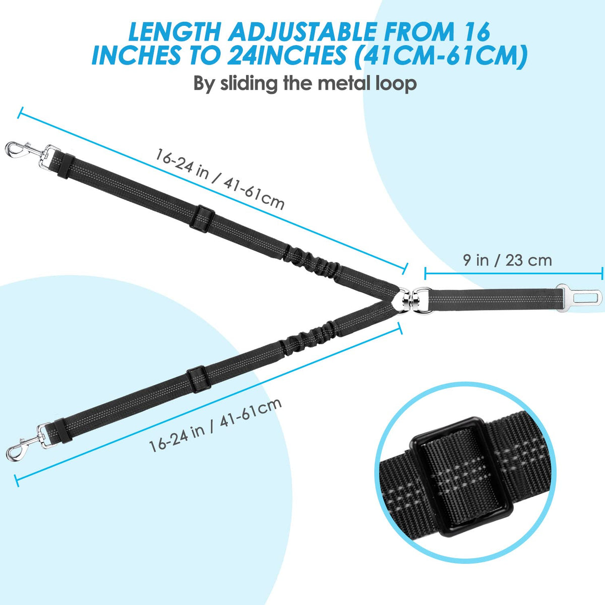 Specifications: Material: Nylon with reflective lines Weight: 180g/6.3oz Size: Two small size seat belts in one Seat Belt Length Range: Adjusted from 16 to 24 inches and Can be stretched to 27 inches
