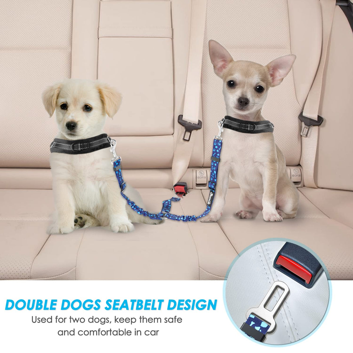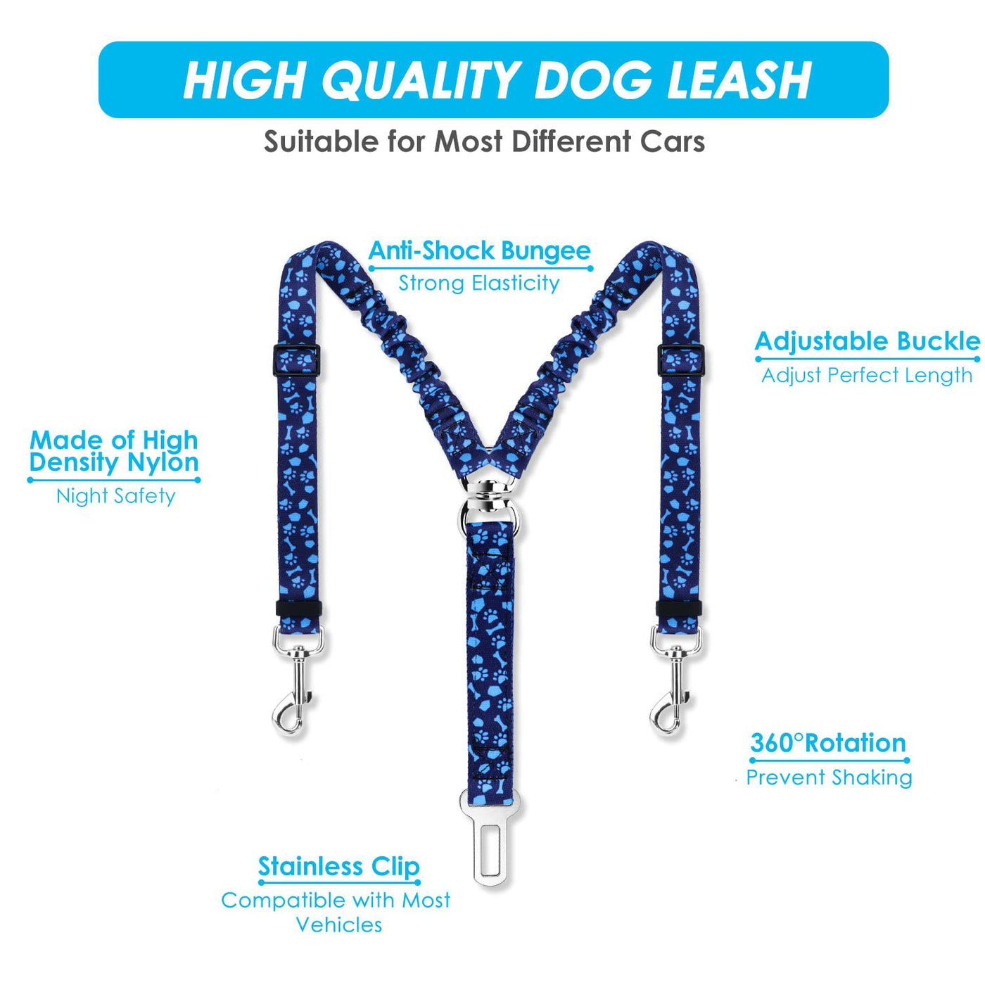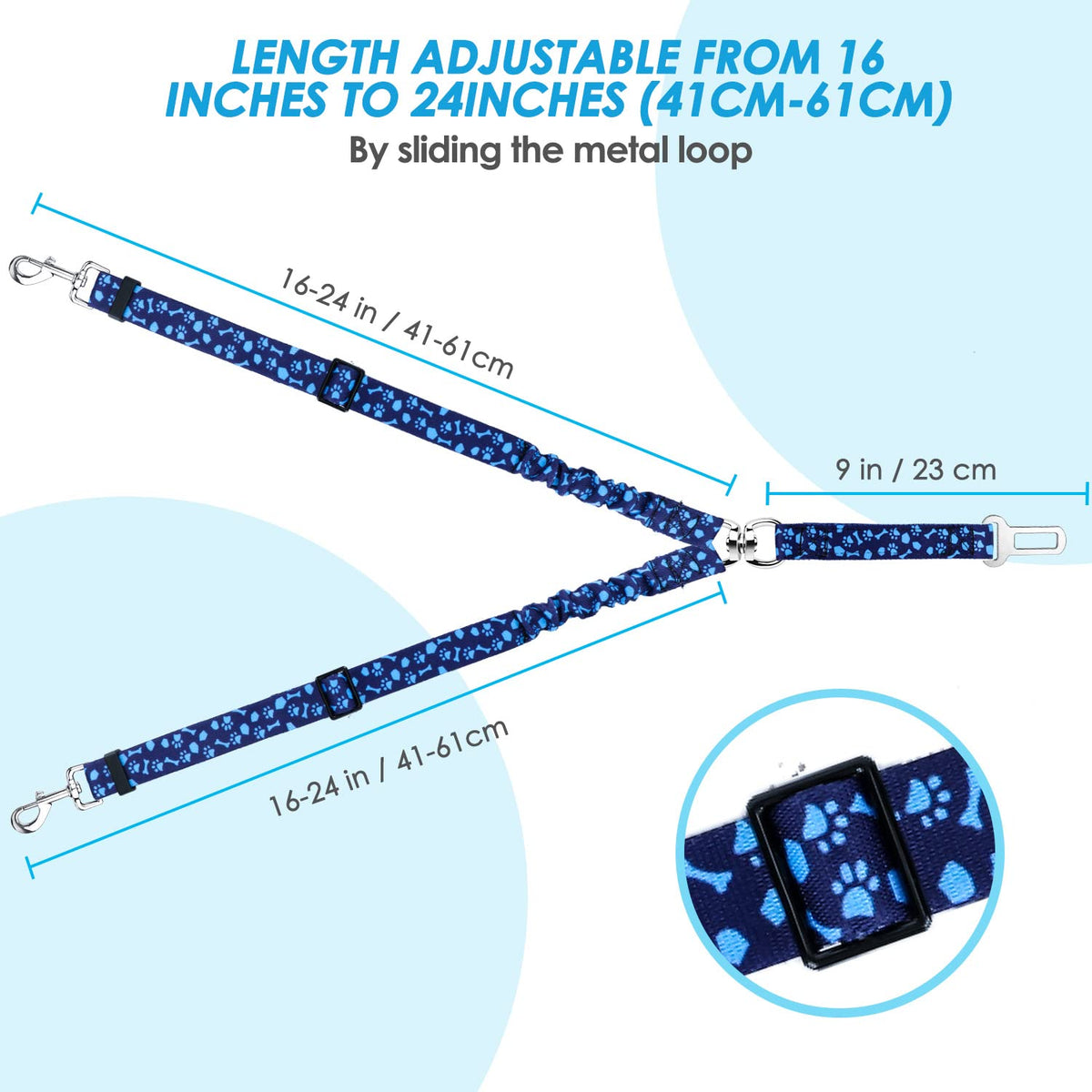 Slowton Dog Seat Belt, Double Dog Seatbelt Adjustable Vehicle Safety Leash With Elastic Bungee Buffer, Reflective No Tangle Y Shape Two Dog Harness Seat Belt Splitter For Pets Car Trip (Blue Paws, S)