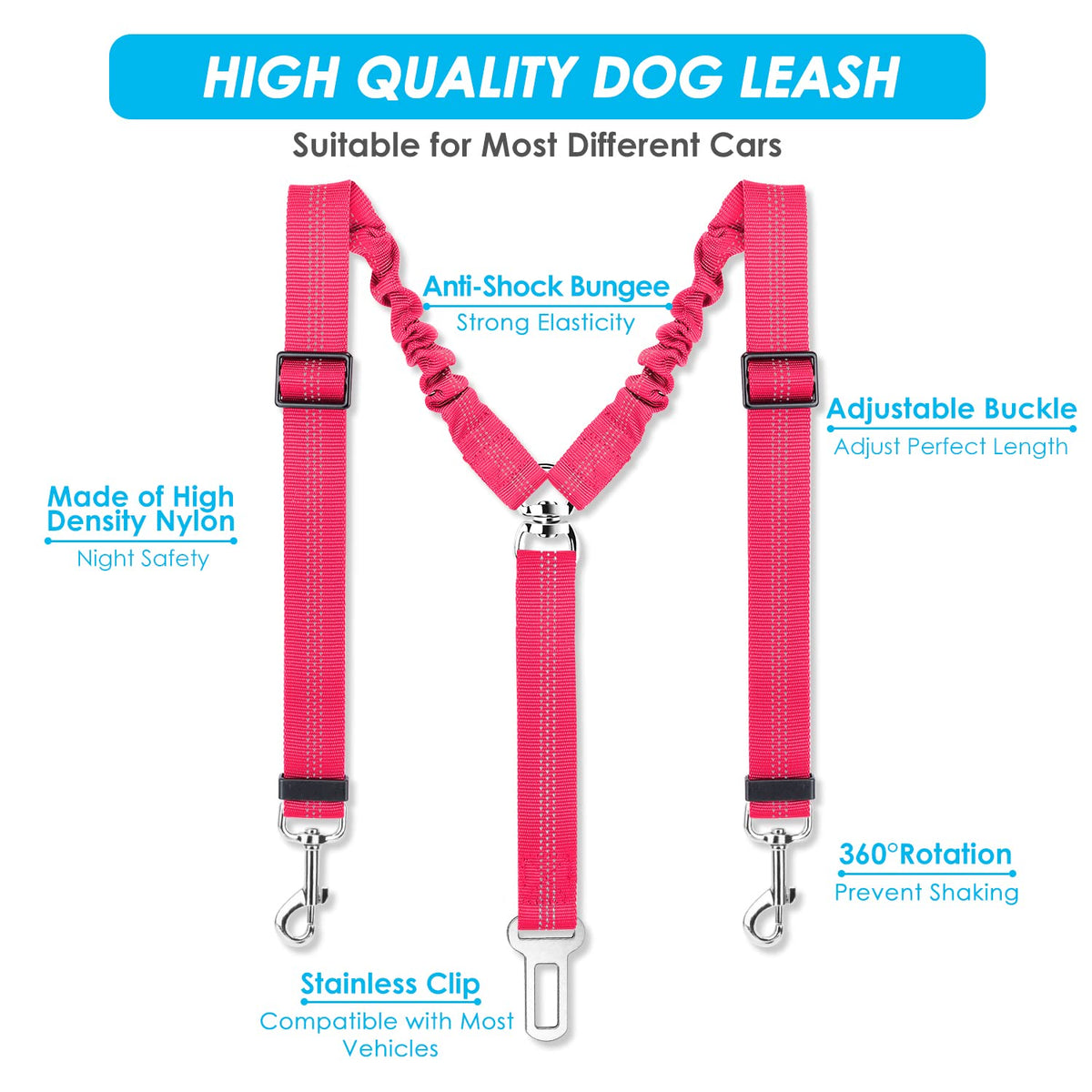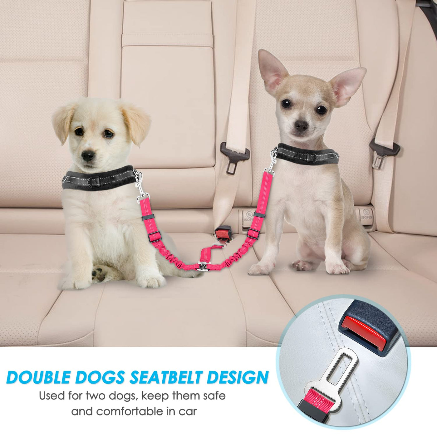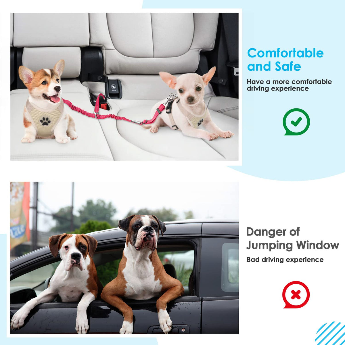 Slowton Dog Seat Belt, Double Dog Seatbelt Adjustable Vehicle Safety Leash With Elastic Bungee Buffer, Reflective No Tangle Y Shape Two Dog Harness Seat Belt Splitter For Pets Car Trip (F-Pink, S)