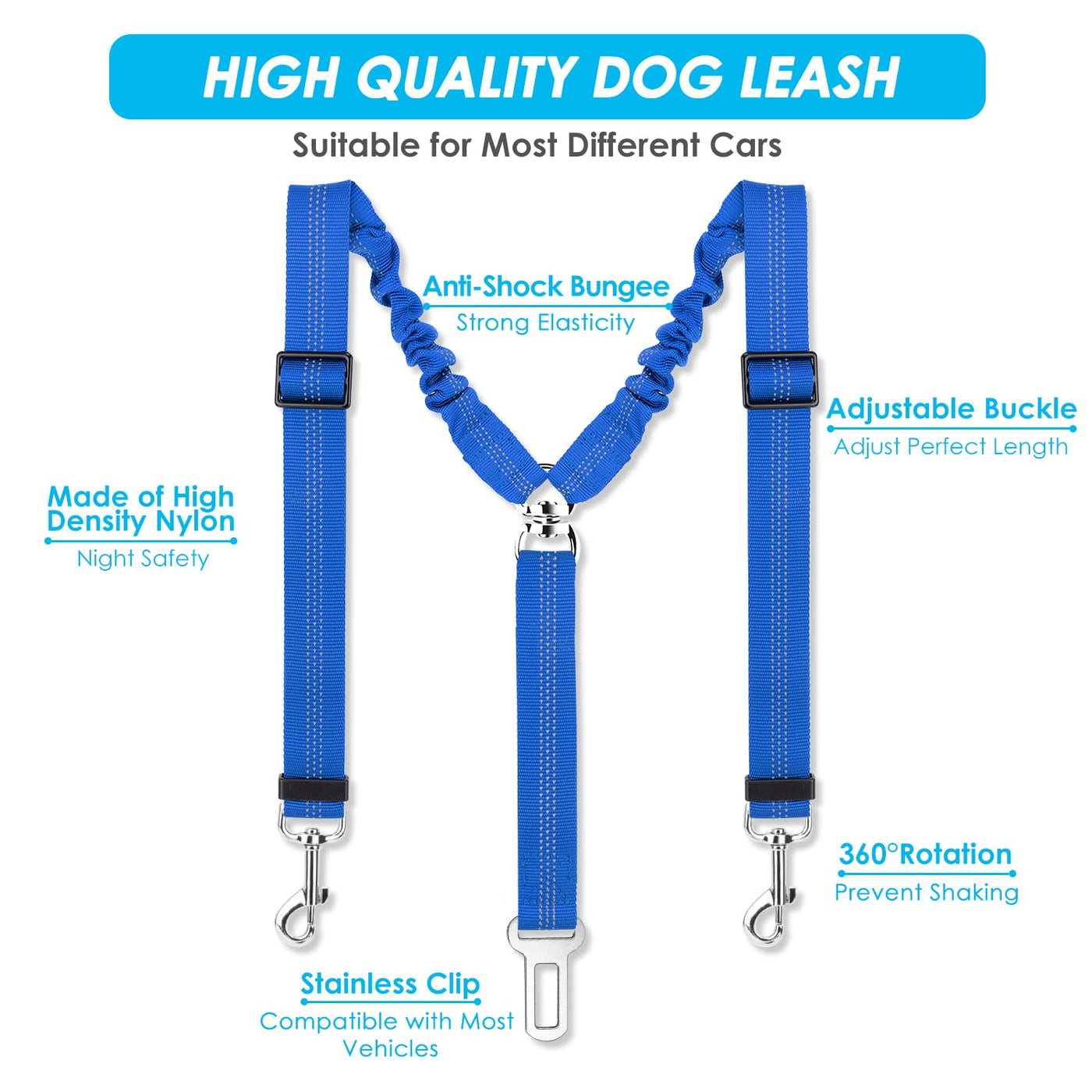 Slowton Dog Seat Belt, Double Dog Seatbelt Adjustable Vehicle Safety Leash With Elastic Bungee Buffer, Reflective No Tangle Y Shape Two Dog Harness Seat Belt Splitter For Pets Car Trip (Light Blue, S)