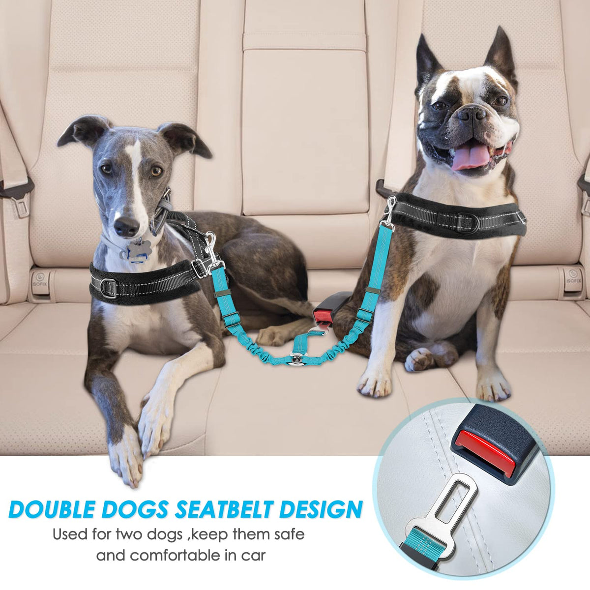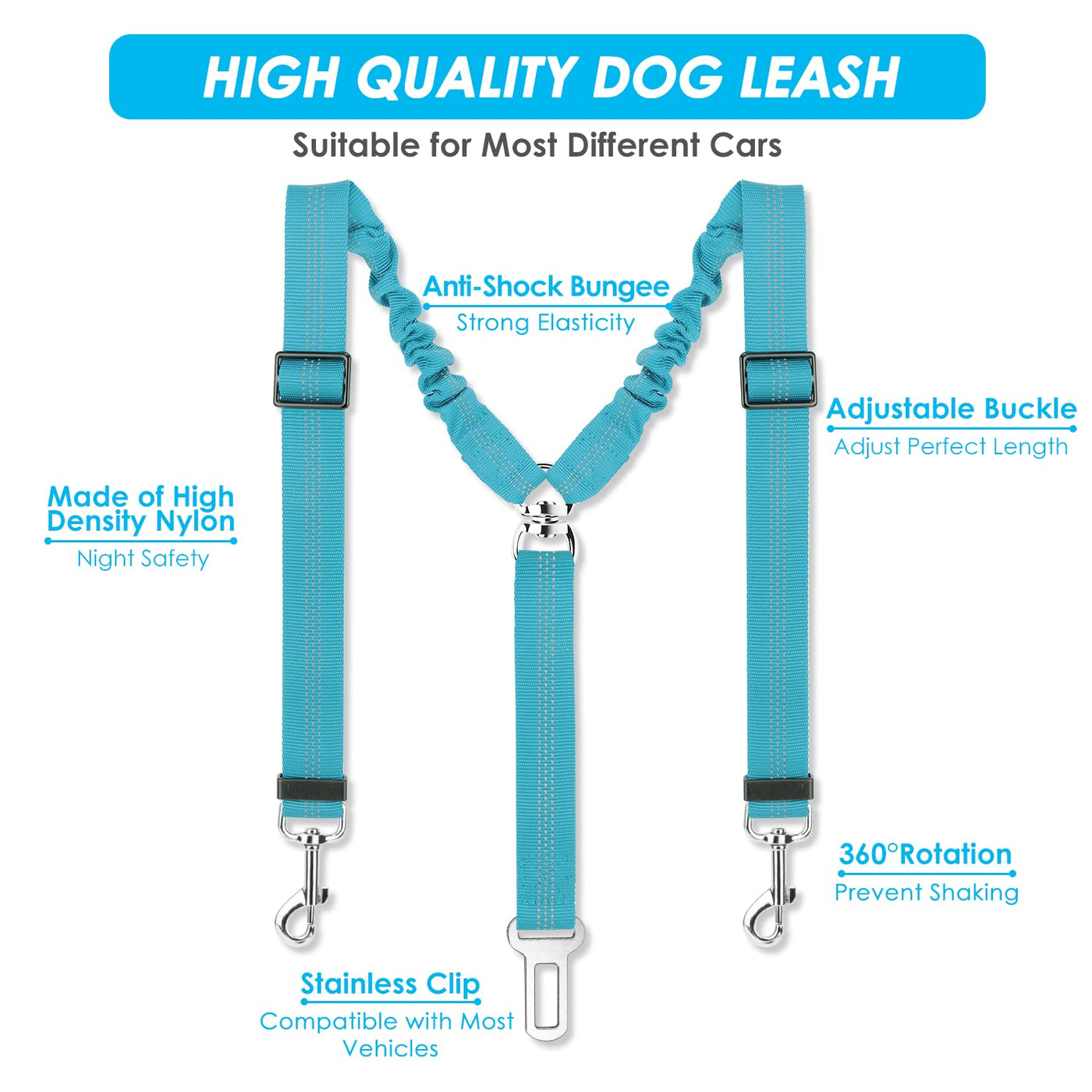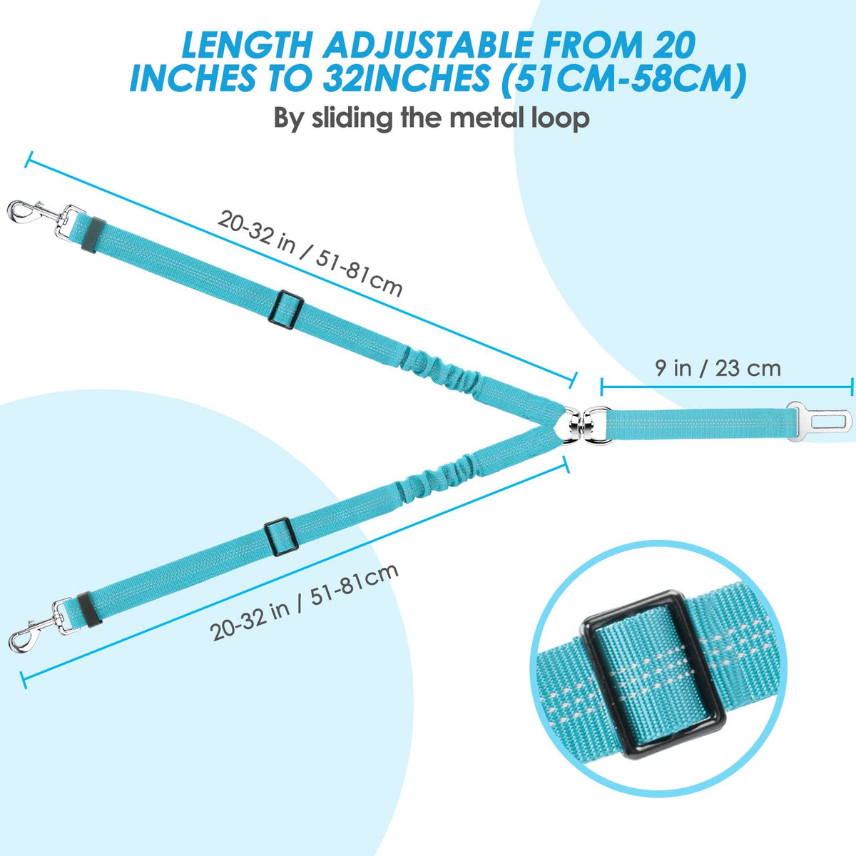 Slowton Dog Seat Belt, Double Dog Seatbelt Adjustable Vehicle Safety Leash With Elastic Bungee Buffer, Reflective No Tangle Y Shape Two Dog Harness Seat Belt Splitter For Pets Car Trip (Mint Blue, M)