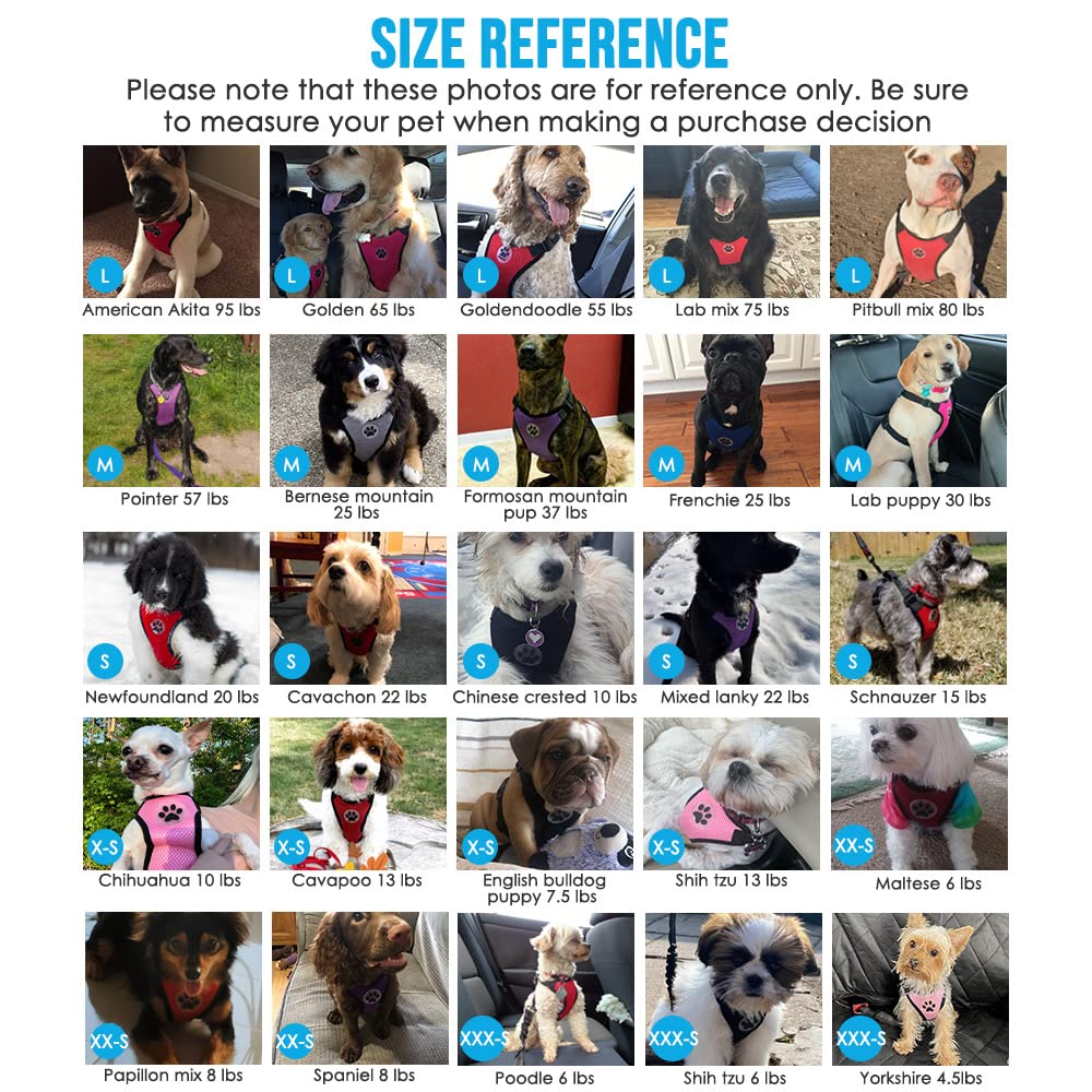 Q: How do I choose the right size for the SlowTon Dog Seat Belt Harness?A: To select the correct size harness, measure your dog's neck and chest girth. Refer to the sizing chart: XXXS (11-13 inch chest, 8.6-10 inch neck), XXS (13.5-16 inch chest, 10.5-12 inch neck), XS (16.5-18 inch chest, 12.5-14 inch neck), S (18.5-21 inch chest, 14.5-17 inch neck), M (21.5-27 inch chest, 17.5-25 inch neck), L (27.5-37 inch chest, 25.5-31 inch neck). If your dog is between sizes, it's advisable to opt for the larger size.