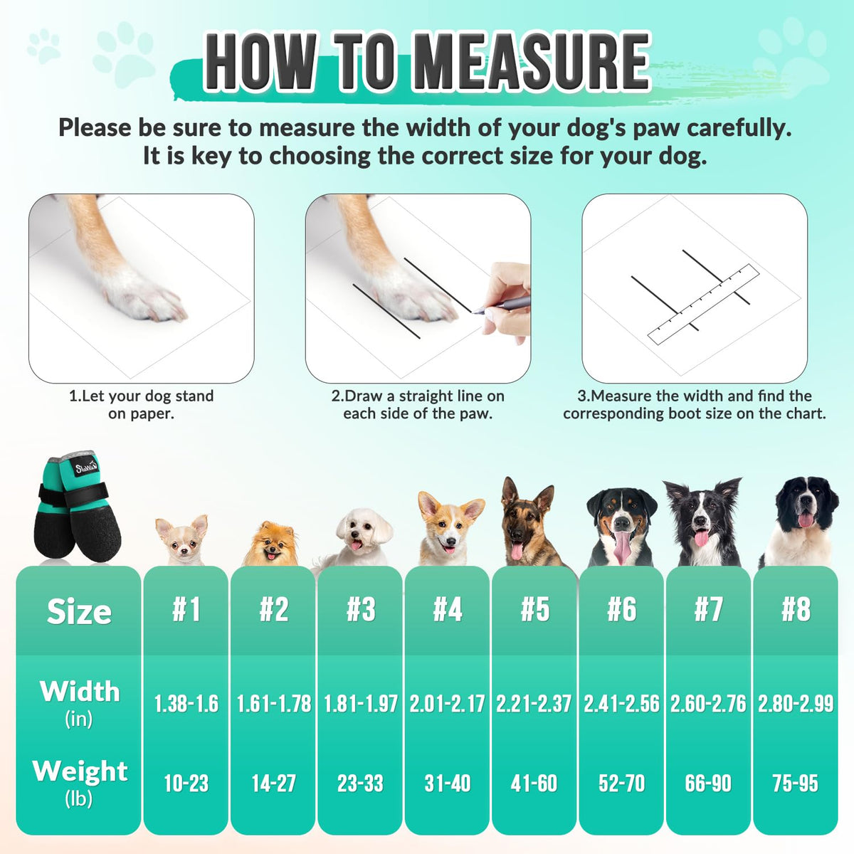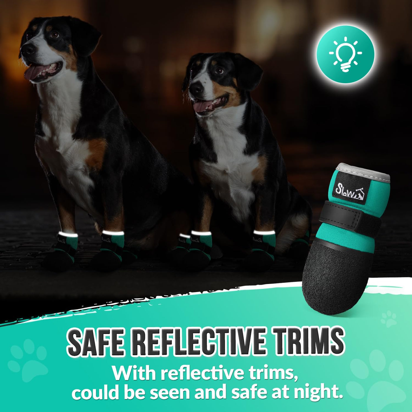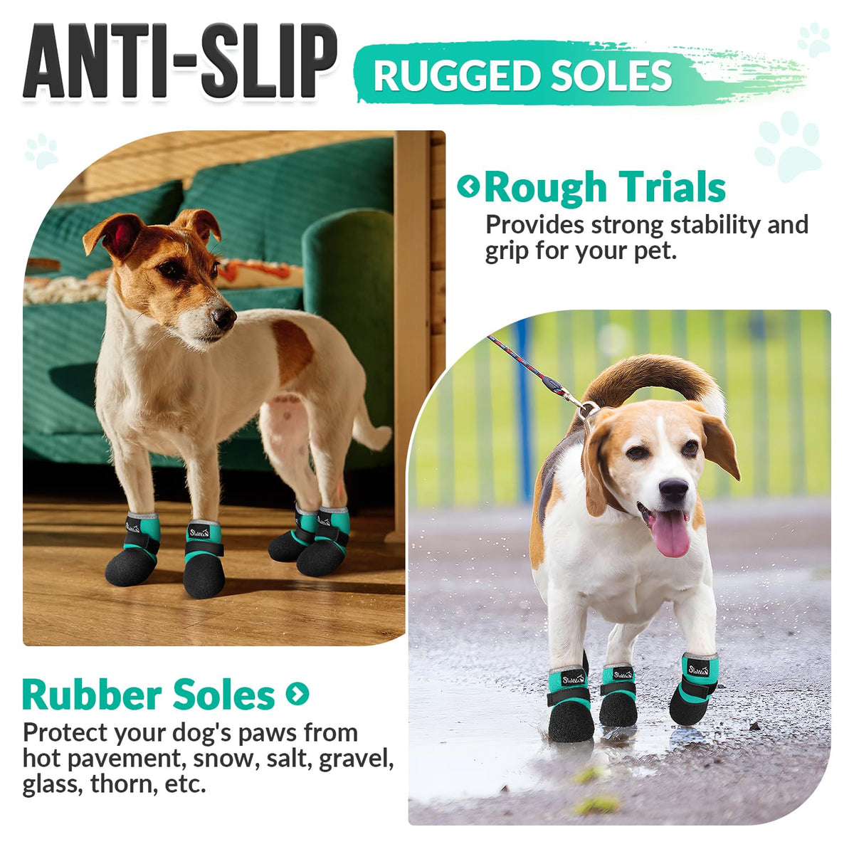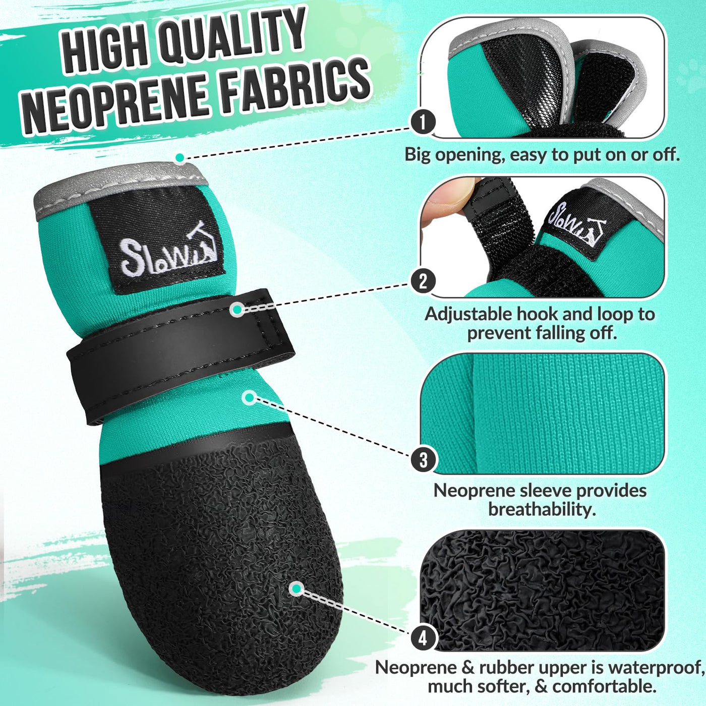 Slowton Dog Shoes, Made Of Waterproof And Breathable Neoprene And Soft Rubber, With Reflective Stripe Designs, Provide Your Dog With A Comfortable And Safe Wearing Experience, Letting Your Puppies Run Or Walking Freely Protects Paws: Made Of Quality Neoprene, Our Dog Shoes Are Breathable, Soft And Durable, Protecting Your Dogs Paws From Road Debris, Shingles, And Cold Or Hot Surfaces Easy To Put On And Take Off: Designed With Hook And Loop Strap At The Opening, These Dog Shoes Make It Easy For You To Put On And Take Off For Your Dog, And Adjustable To Better Accommodate For Different Sizes Of Feet Non-Slip And Waterproof Rubber Sole: Our Dog Booties Feature A Pleated Rubber Sole, Which Is Soft, Waterproof And Non-Slip. These Dog Boots Avoid Their Paws Getting Wet On Rainy Or Snowy Days, And Allow Puppies Move And Stabilize On Indoor Floors And Outdoor Surfaces Reflective Stripes Design: There Is A Reflective Stripe Design On The Openings Of Non-Slip Dog Booties, Which Improves The Visibility At Night, Promoting The Safety Of Walking In Low Light Environment Or At Night Specification: Product Name: Dog Shoes Material: Neoprene + Rubber Color(Available): Rosy Red, Green, Black + White Included Items: 4 Dog Shoes