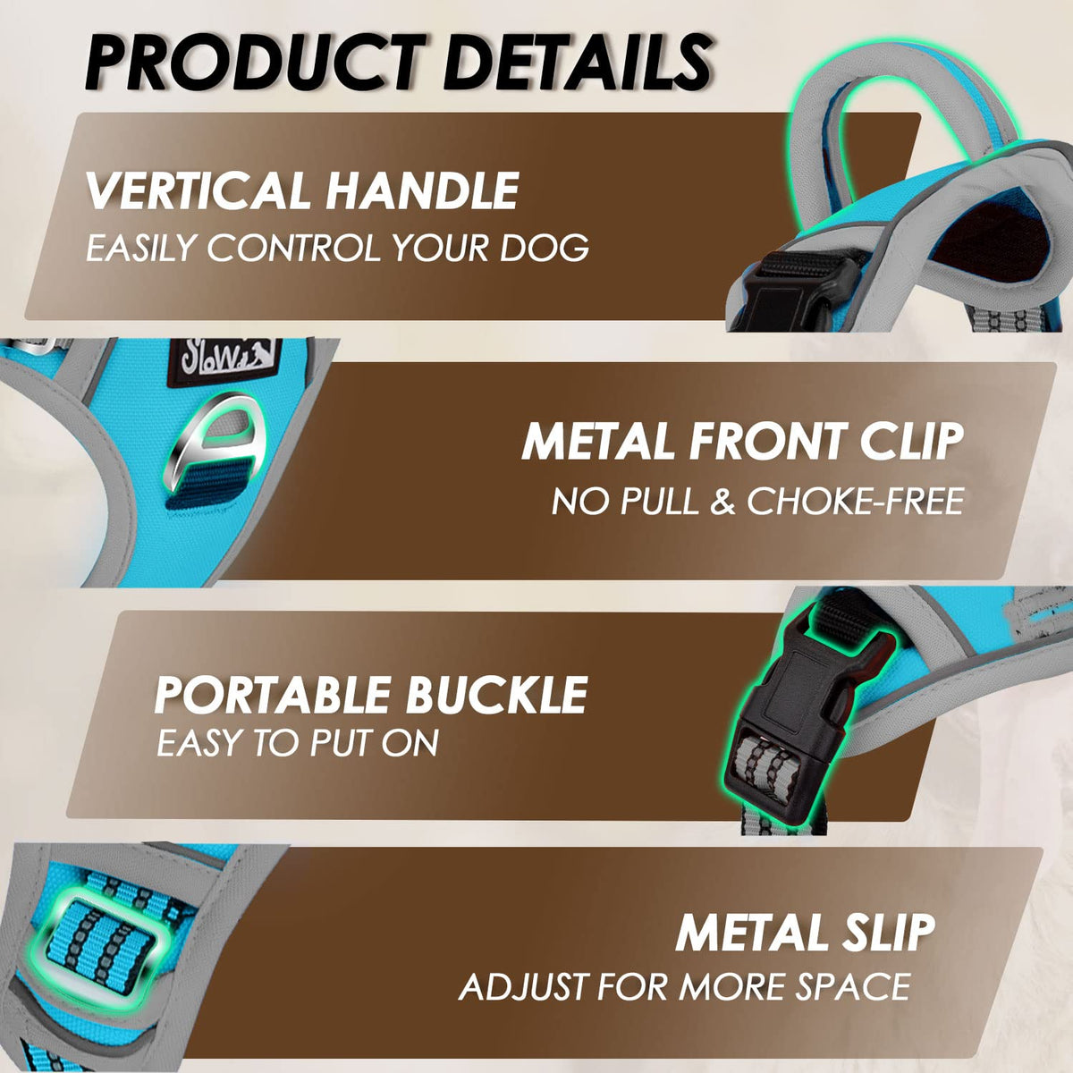 Q: How does the no-pull feature work on this harness?A: The no-pull feature of the SlowTon harness is designed with two sturdy metal D-rings. The front clip discourages pulling by turning your dog around when they pull, helping them learn to walk without pulling. The back clip is suitable for casual walking, running, or hiking.