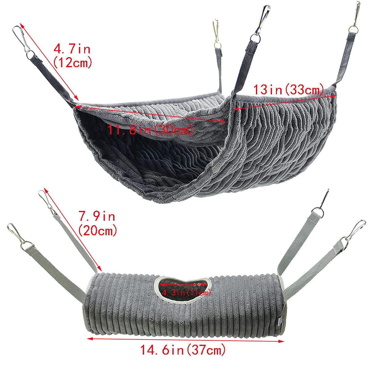Features: Security And Protection Are Natural Animal Needs, Especially For Small Animals Like Ferrets And Rats. That'S Why Most Of These Cute Mammals Prefer To Sleep In Smaller, Confined Spaces, Like Hammocks Or Fabric Huts. Our Double Bed Bunked Hammock Features A Tunnel-Like Design That Gives Your Pet Ferret, Chinchilla, Rabbit, Guinea Pig, Or Rat A Place To Swaddle And Hide When Feeling Vulnerable. 1.The Hanging Hammock Can Also Used As A Sleeping Pouch. It Helps To Encourage Some Shy Friends That Are Hesitant To Use Hammocks Due To Their Exposed Nature. Allows Them To Feel The Comfort Of Snuggling In Suspension While Still Have The Security Under Soft Fleece. 2.Cute Shape Design. Your Small Animals Will Like To Sleep Or Hide In It.Well-Exercised Pets Are Healthier, Happier, And Live Longer. Our Hammocks Not Only Give You Extra Floor Space, But It Also Allows Your Ferrets To Have An Exercise Area As They Play And Go Up And Down The Hammock And Cage Floor.Our Hammock Is Definitely A Multipurpose Pet Cage Accessory--Comfy Bedding And Toy, Blanket And Hideaway! 3.Best For Guinea Pig,Chinchilla, Ferrets,Parrot, Bunnies, Rats,Mice,Hamster,Flying Squirrel, Sugar Glider , Hedgehog,Berbil,Degu, Parrakeet And Other Small Pet Animals. 4.This Combo Set Can Be Used As: Hamster Ferret Toys ,The Ferret Double Bunkbed Hammock Keeps Your Pets Happy And Comfortable! Material: Super Soft And Cozy Material Colour: As Shown In The Picture Size: Hanging Hammock: Top Length 13-Inches,Upper Width 11.8-Inches,Deepth 11-Inches. Hideout Tunnel: 14.6' Long,Entrance Diameter 4.3' Packing Includes: 1 X Hanging Hammock 1 X Hideout Tunnel Note: 1~2Cm Measurement Error Is A Reasonable Range, Due To The Manual Measurement Methods.Meanwhile, Please Be Reminded That Due To Lighting Effects, Monitor'S Brightness Contrast Settings Etc, There May Be A Little Difference In The Color Of The Pictures And The Actual Item.