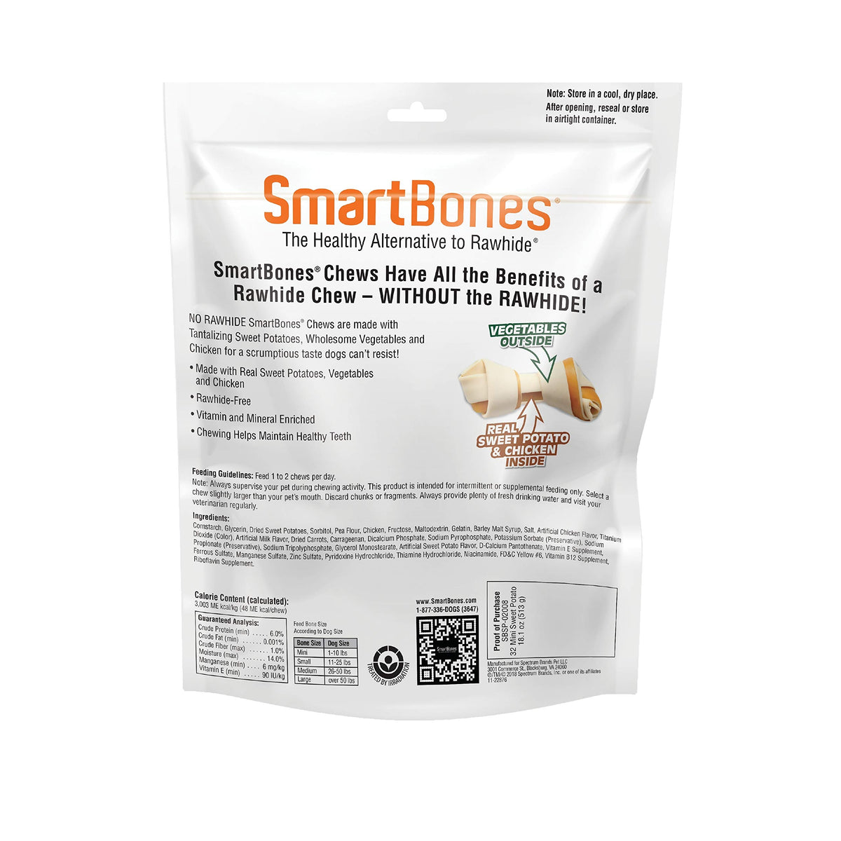 SmartBones Mini Chews with real sweet potato are made with real chicken and wholesome vegetables for a scrumptious taste dogs cant resist. These bone-shaped treats have a vegetable outside wrapped around real chicken and sweet potato inside. A healthy alternative to rawhide, these vitamin and mineral enriched chews are easy to digest while still satisfying your dogs natural urge to chew. Chewing helps maintain healthy teeth. Giving your dog a treat that you both love just got a whole lot easier! Contains 32 chews. Feed your dog 1 to 2 chews per day. Always supervise your pup during chewing activity. These chews are for intermittent or supplemental feeding only. Select a chew slightly larger than your pets mouth. Discard chunks or fragments. Always provide plenty of fresh drinking water and visit your veterinarian regularly. Store in a cool, dry place. After opening, reseal or store in an airtight container to preserve freshness.
