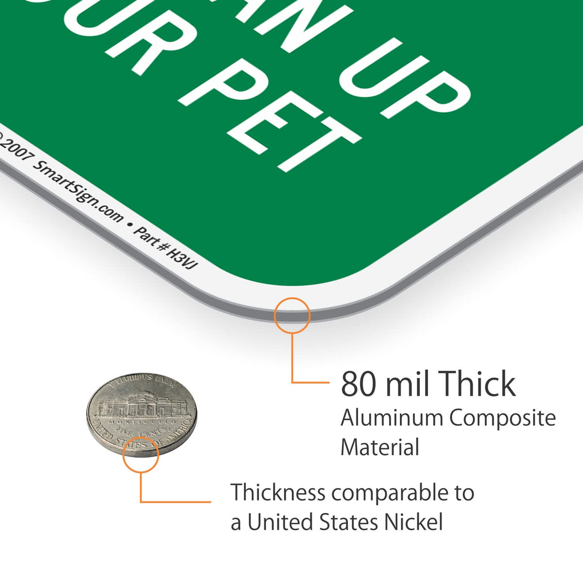 DURABLE CONSTRUCTION: 2mm thick All Pets Must Be On Leash signs are built from tough ACM (Aluminum Composite Material) which has a thick aluminum outer layer and a durable plastic core. These metal signs outlast plastic and corrugated signs by several years outdoors.