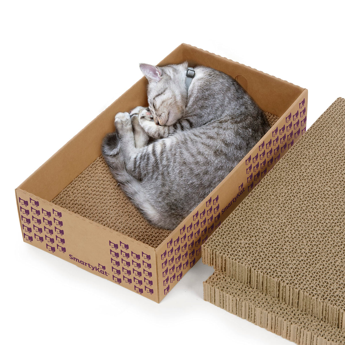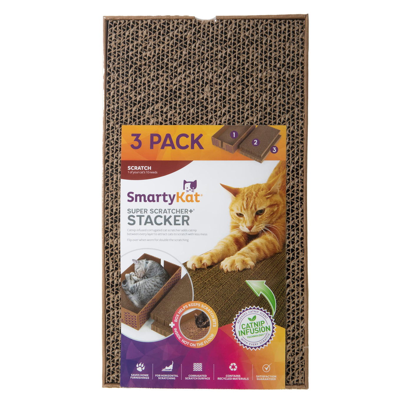 Smartykat Super Scratcher+ Stacker Box Comes With Three Reversible Scratch Pads. When One Side Is Worn, Simply Flip It Over For A New Scratch Surface; When Both Sides Are Worn, Move On To The Next Scratch Pad. You Can Stack The Scratch Pads For A Scratch And Lounge Area Or Use One Or Two At A Time For A Scratch Cuddler. The High Walled Tray Also Helps To Contain Scratch Debris, Keeping It Off The Floor. Our Catnip Infusion Technology Attracts Cats To Scratch, Redirecting Them From Scratching Your Furnishings And Making Less Mess Than Loose Catnip. Each Layer Of Corrugate Is Infused With Chemical-Free Catnip Before The Block Is Formed, Releasing Potent Catnip Scent With Every Scratch. The Tray Itself Also Holds A Catnip Scent, And Will Quickly Become Your Cats Favorite Box To Sit In. The Instinct To Scratch Is Hard-Wired Into Cats. Cats Scratch To Mark Territory, Promote Healthy Nail Growth, Tone Muscles, And To Help Alleviate Stress. Figuring Out Your Cat'S Preferred Scratching Surface Can Feel Like Guesswork. To Make Your Life Easier, We Recommend Trying Out Corrugated Scratchers First, Because The Texture Closely Mimics Tree Bark - One Of The Most Common Surfaces Felines Love Digging Their Claws Into When Out In Nature. Great For A Multiple Cat Household Or A Great Gift For Your Aggressive Scratch Enthusiast. Smartykat Toys, Beds And Scratchers Are Designed To Meet The Needs Of Your Cat: Exercise, Hunt, Stimulation, Interaction, Scratch And Comfort Without Forgetting About Fun! Kids And Pets Often Share The Same Space In The Home And Will Have Access To Each Others Toys. That Is Why We Design Products To Meet Child Safety Standards; Ensuring Kids In The Home Are Safe, Whether They Are Two-Footed Or Four-Pawed! We Utilize Recycled And Sustainable Materials Wherever Possible. Please Read All Packaging Instructions, Warnings And Cautions Upon Receipt. Packaging May Contain Small Parts, Discard After Opening.