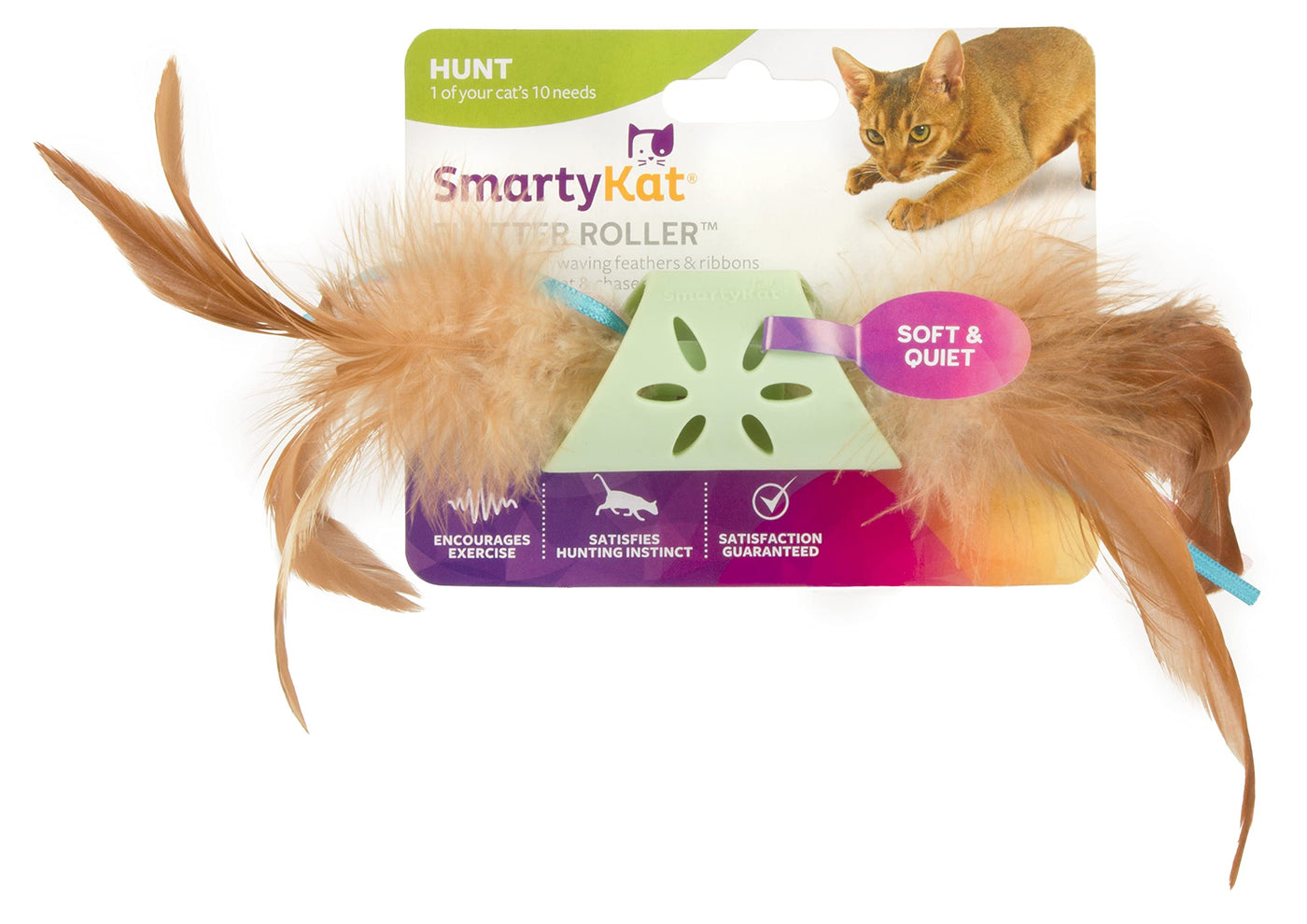 SmartyKat Flutter Roller Chase Cat Toy provides bouncy and chase-able fun for your cat. It rolls across any surface and has real fluttering feathers to attract cats like a magnet. Ribbons and flexible tube offer textural differences for dynamic and stimulating play. This lightweight, easy to bat and carry new toy will be a feline favorite, satisfying your cat’s need to hunt with kinder 'prey'. SmartyKat toys, beds and scratchers are designed to meet the needs of your cat: Exercise, Hunt, Stimulation, Interaction, Scratch and Comfort without forgetting about FUN! Kids and pets often share the same space in the home and will have access to each other’s toys. That is why we design products to meet child safety standards; ensuring kids in the home are safe, whether they are two-footed or four-pawed! We utilize recycled and sustainable materials wherever possible. Please read all packaging instructions, warnings and cautions upon receipt. Packaging may contain small parts, discard after opening.