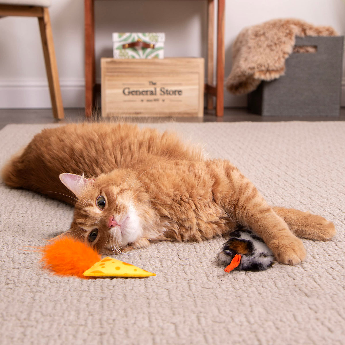 Instincts by SmartyKat Mouse 'N Mate Set of 2 releases your cat's inner instincts with a lightweight floppy faux fur plush body that mimics the feel of stunned prey; and a felt cheese slice toss and bat toy complete with feathers and ribbons to tempt feline paws. The mouse toy is refillable for long-lasting fun and comes with a bonus resealable tube of catnip and silvervine. Its felt cheese mate contains HappyNip Silvervine and Catnip to drive cats wild. Even cats who don't typically respond to catnip will respond to silvervine, making HappyNip a great source of fun and entertainment for finicky felines. Spark the fun and give your cat a satisfying hunt with safer and kinder 'prey.' SmartyKat creates stylish cat products that help pet owners easily meet their cats' emotional, physical, and instinctual needs. Each product is designed to fulfill a particular feline need while fostering a stronger relationship between you and your cat. From scratchers and interactive toys to edible grass and catnip, SmartyKat keeps your feline companion's health, safety, and well-being at the core of everything we make. Giving pet parents the best of all worlds: innovative products, stylish designs, environmental responsibility, and affordability all in one place, satisfaction guaranteed! Please read all packaging instructions, warnings and cautions upon receipt. Packaging may contain small parts, discard after opening.