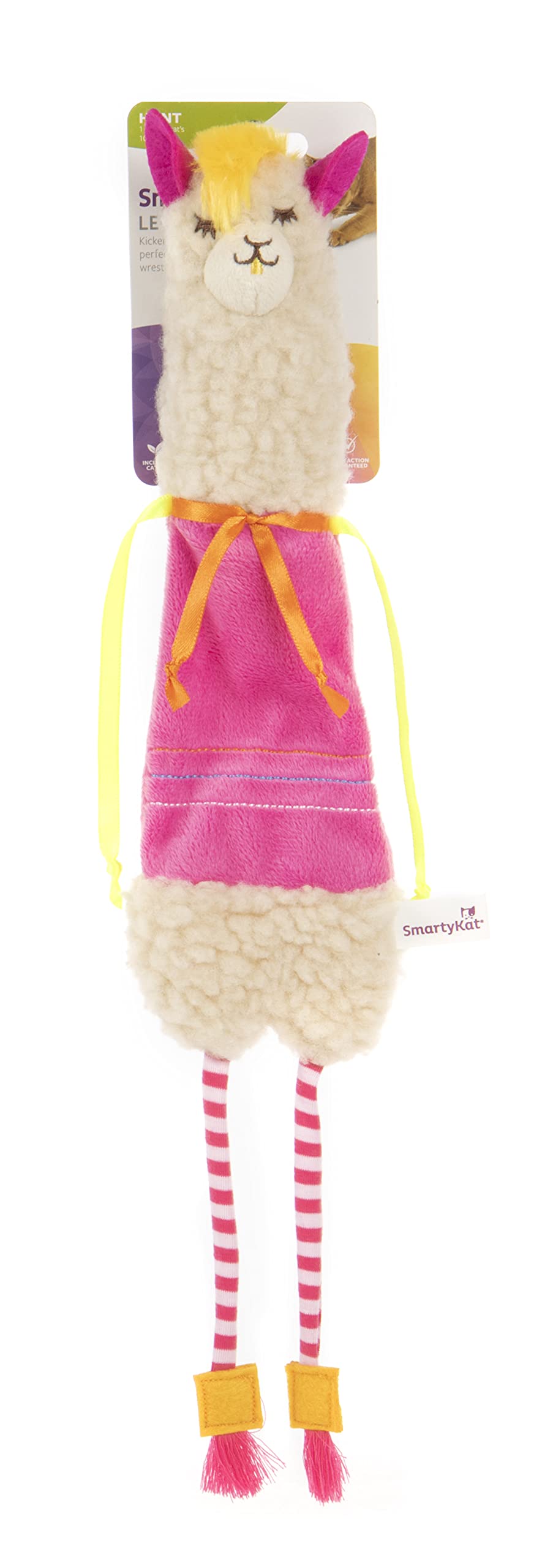 SmartyKat Leggy Llama Kicker Plush will spark your cat’s hunting instinct. With soft fleece and crinkle sounds that cat’s love to knead and pounce, along with an under-stuffed, soft, floppy body with long dangly legs, this toy is designed to withstand your kitty's instinctual 'bunny kicks'. Kicker toys are an outlet for one of your cat’s first playful behaviors. Kittens often wrestle and kick with their litter mates; it’s a comforting and enjoyable play style. Multi-textured with catnip, this toy will satisfy your cat’s hunting and kicking instinct. Works as a solo toy, or toss and dangle for interactive fun. SmartyKat toys, beds and scratchers are designed to meet the needs of your cat: Exercise, Hunt, Stimulation, Interaction, Scratch and Comfort without forgetting about FUN! Kids and pets often share the same space in the home and will have access to each other’s toys. That is why we design products to meet child safety standards; ensuring kids in the home are safe, whether they are two-footed or four-pawed! We utilize recycled and sustainable materials wherever possible. Please read all packaging instructions, warnings and cautions upon receipt. Packaging may contain small parts, discard after opening.