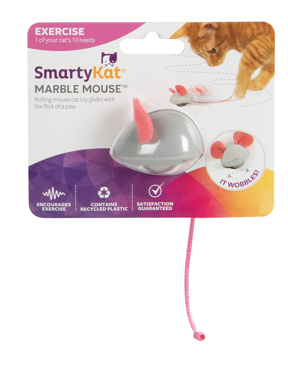 Q: What makes the SmartyKat Marble Mouse Cat Toy engaging for cats?A: The SmartyKat Marble Mouse Cat Toy is designed to roll and wobble unpredictably with a light push, mimicking the movement of real prey. This stimulates your cat's natural hunting instincts, encouraging them to chase, pounce, and engage in active play.